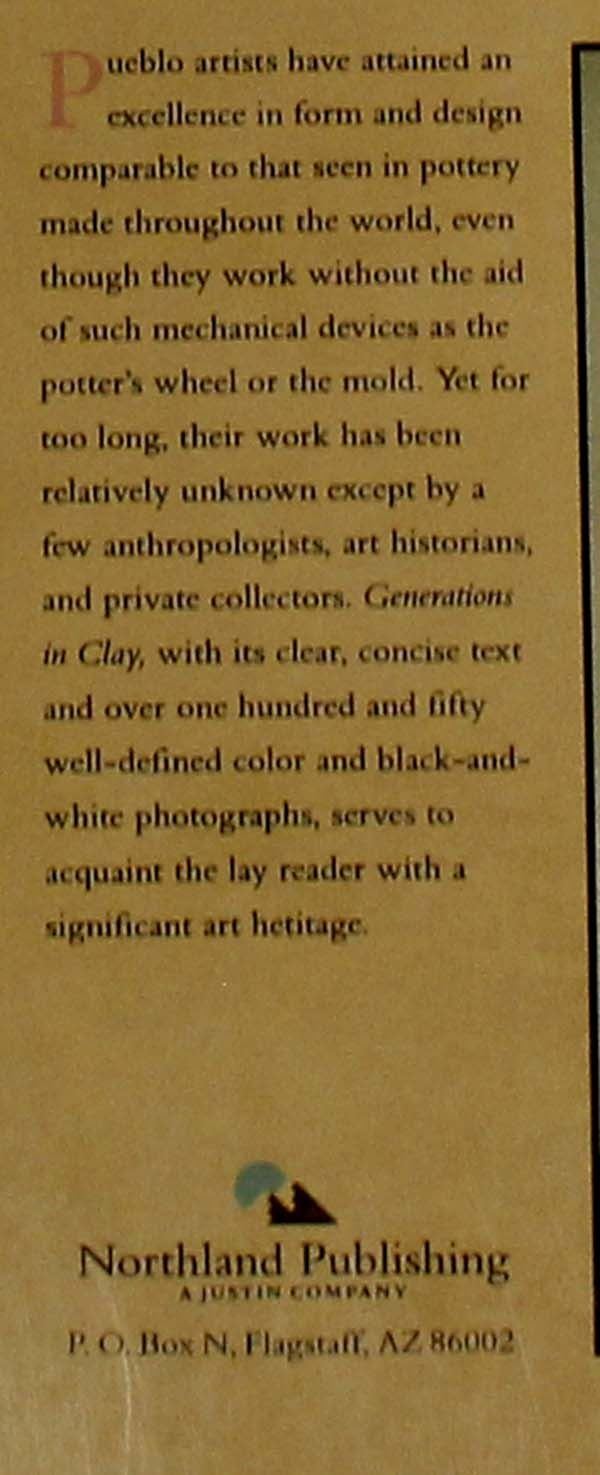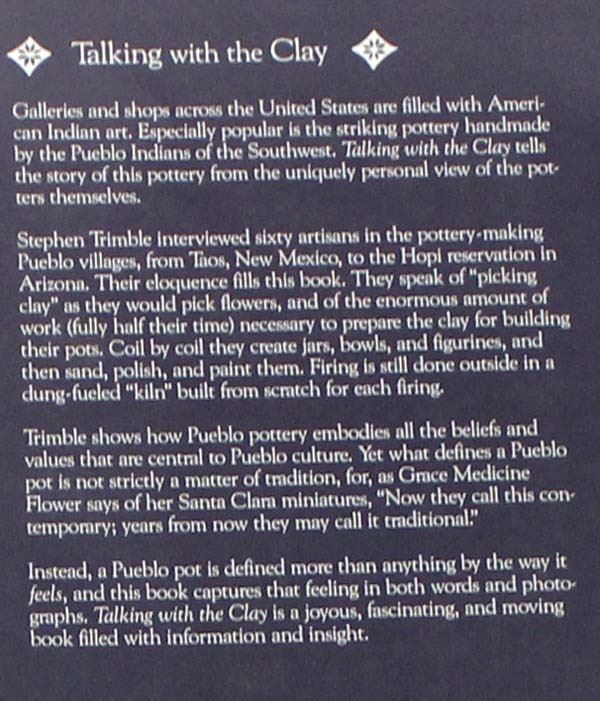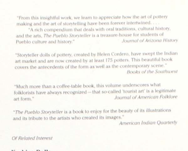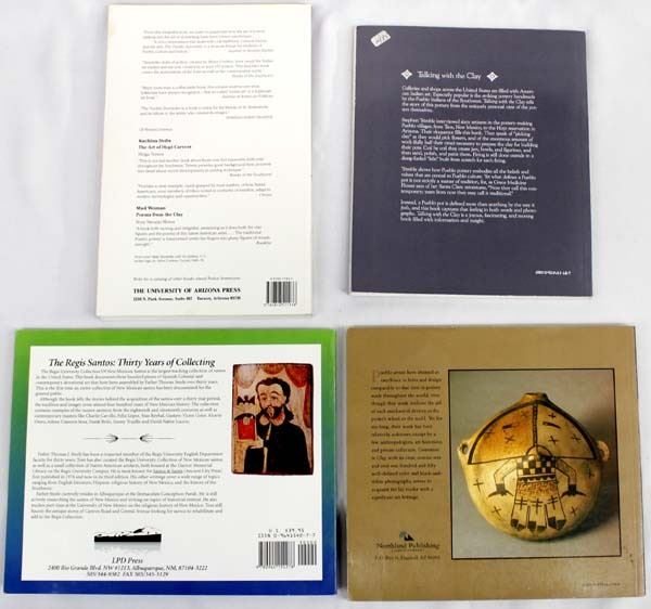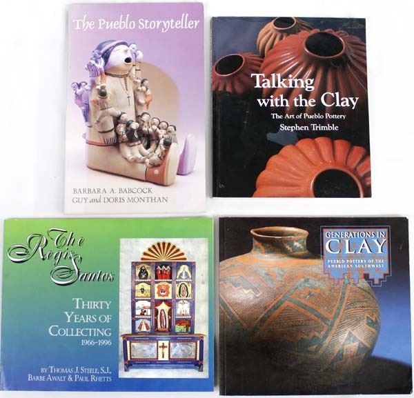 4 Softback Reference Books, includes 1. The Regis Santos Thirty Years of Collecting 1966-1996 by Thomas J. Steele, S.J., Barbe Awalt & Paul Rhetts, LPD Press, 1997 2. The Pueblo Storyteller by Barbara A. Babcock, Guy & Doris Monthan, U of AZ Press, 1992, largest measures 7'' x 11'', like new condition 3. Generations in Clay: Pueblo Pottery of the American Southwest by Alfred E. Dittert, Jr. and Fred Plog. Northland Publishing, 1980. 4. Talking with the Clay: The Art of Pueblo Pottery by Stephen Trimble. SAR Press, 1987