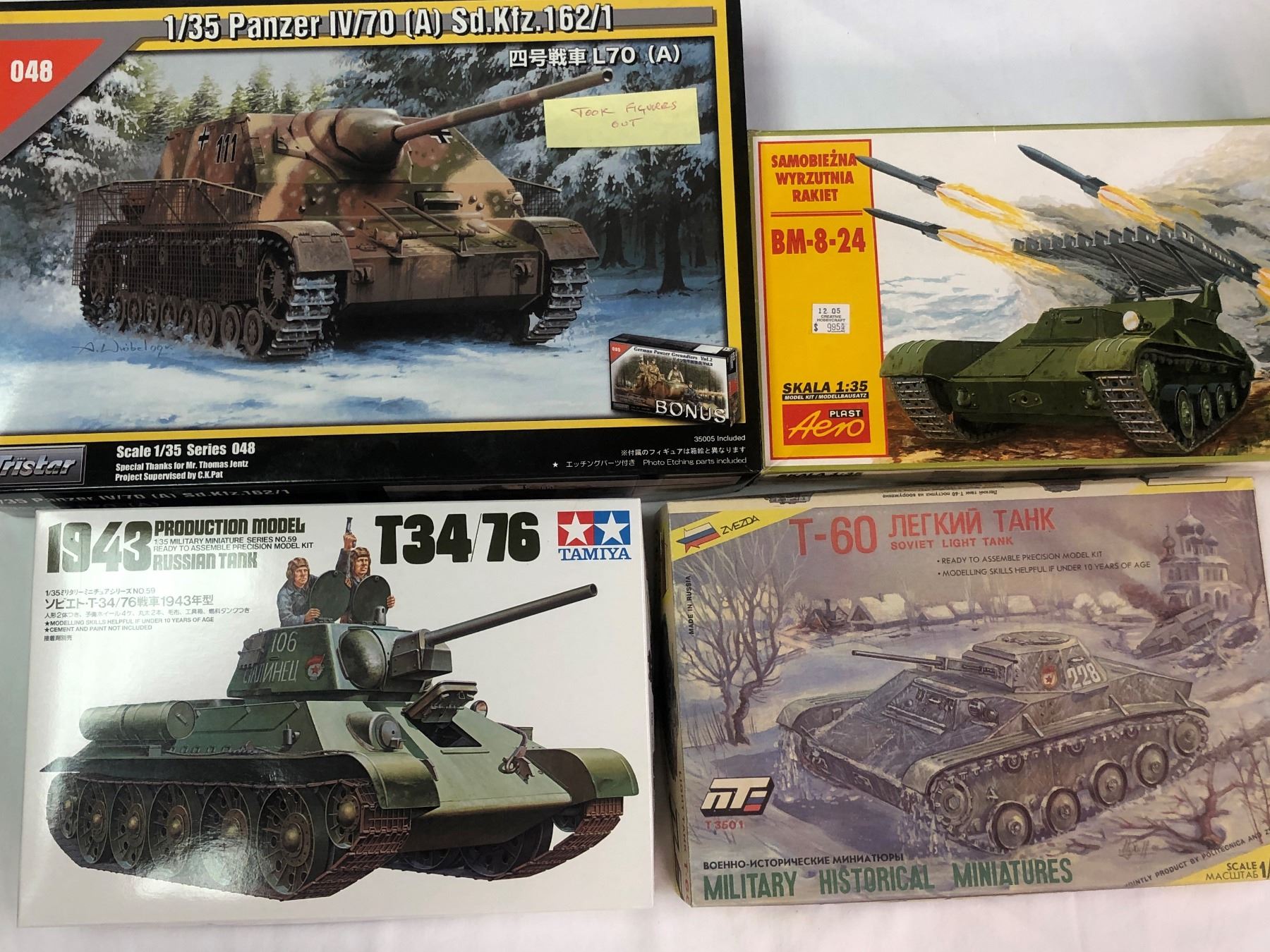 4 Started 1/35th scale armor model kits T34 76 1943, T-60, 1735 Panzer, etc...