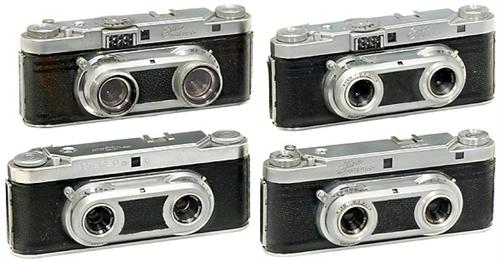 4 Stereo Cameras "Wirgin/Edixa" Wirgin, Wiesbaden. 1) "Wirgin Stereo", 1954, rare name variant of "Edixa Stereo", Steinheil "Cassar 3,5/35 in Vario shutter, focusing scale feet. - 2) "Edixa Stereo IIa", 1954, Steinheil "Cassar 3,5/35" in Prontor-SVS shutter, rangefinder, focusing scale meter. - 3) "Edixa Stereo III", 1954, Steinheil "Cassar 3,5/35" in Prontor-SVS shutter, rangefinder and lightmeter (dead cell), focusing scale feet. - And: 4) "Edixa Stereo IIIa", 1954, Steinheil "Cassar 3,5/35" in Prontor-SVS shutter, rangefinder and lightmeter (dead cell), focusing scale feet. With 2 Tiffen adapters with series #5 sky filters.<Br>