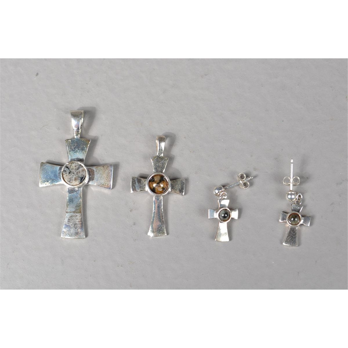 To include a large pendant a small pendant and a pair of earrings all with central matching stone. Longest measures 1.375" L. 8 grams TW. Circa 20th c. Private collection Glennie, MI