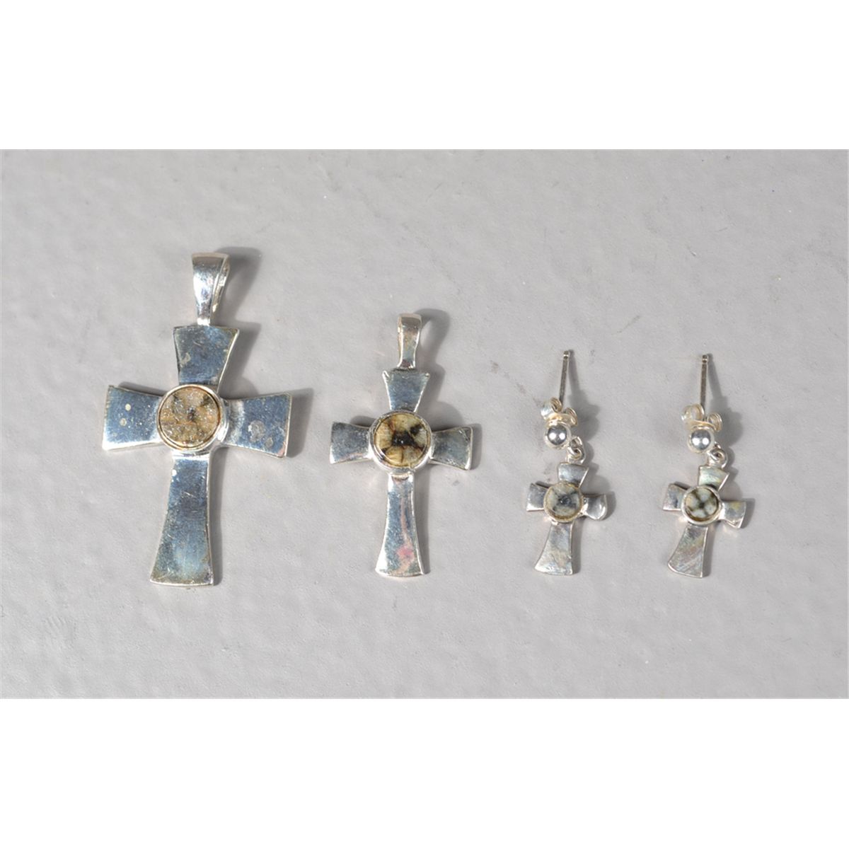 To include a large pendant a small pendant and a pair of earrings all with central matching stone. Longest measures 1.375" L. 8 grams TW. Circa 20th c. Private collection Glennie, MI