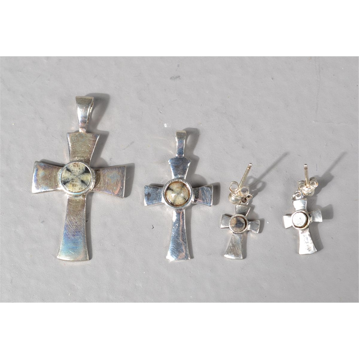 To include a large pendant a small pendant and a pair of earrings all with central matching stone. Longest measures 1.375" L. 8 grams TW. Circa 20th c. Private collection Glennie, MI