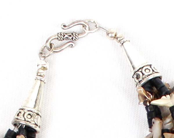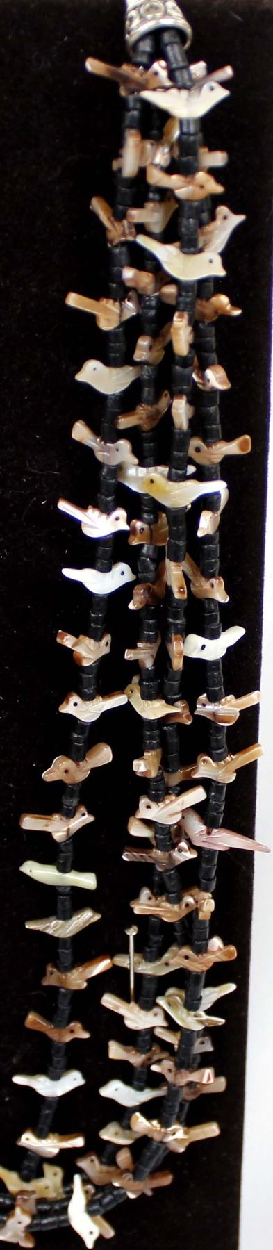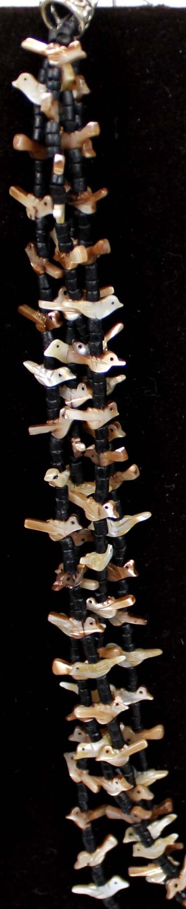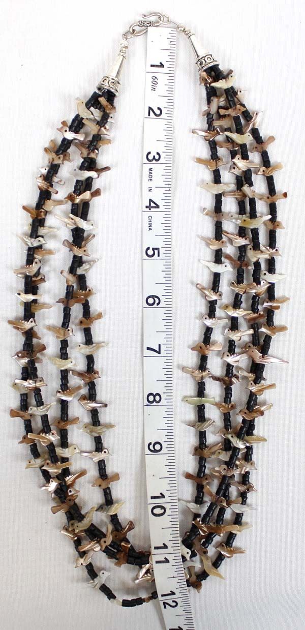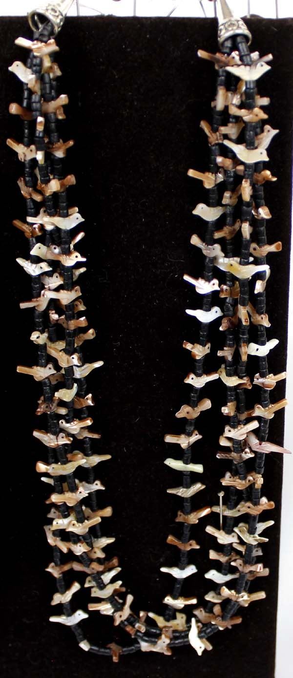 4 Strand Mother-of-Pearl bird fetish necklace with black shell heishi spacers, silver-tone cones and shepherd hook closure. Measures 26'' end to end. The magic of the Desert Southwest is timeless in its display of open landscapes, sunrise and sunset colors with infinite possibilities of artistic expression. The design studio of Quail Ridge was founded on these possibilities, forging an endless variety of earthen gems to their metallic counterparts. The artist, Larry McLellan, designs jewelry contemporary in style, while maintaining elements of native designs.