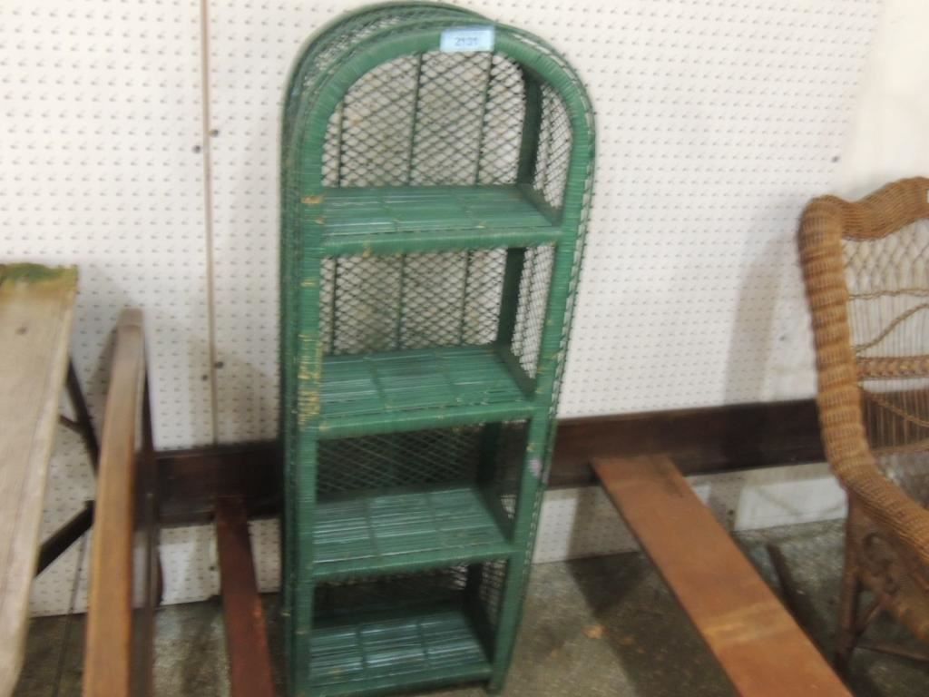 BOOKCASE, STORAGE SHELVES, WICKER VINTAGE DOME TOP WICKER SHELVES AS SHOWN SEE PHOTO FOR MORE DETAILS.