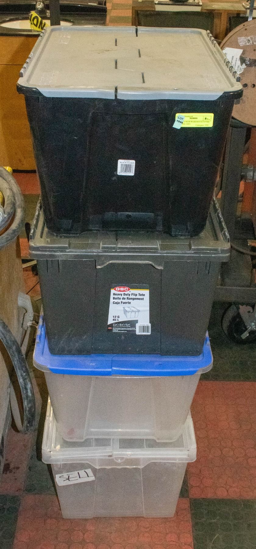 4 TOTES WITH WAREHOUSE STYLE FOLDING LIDS