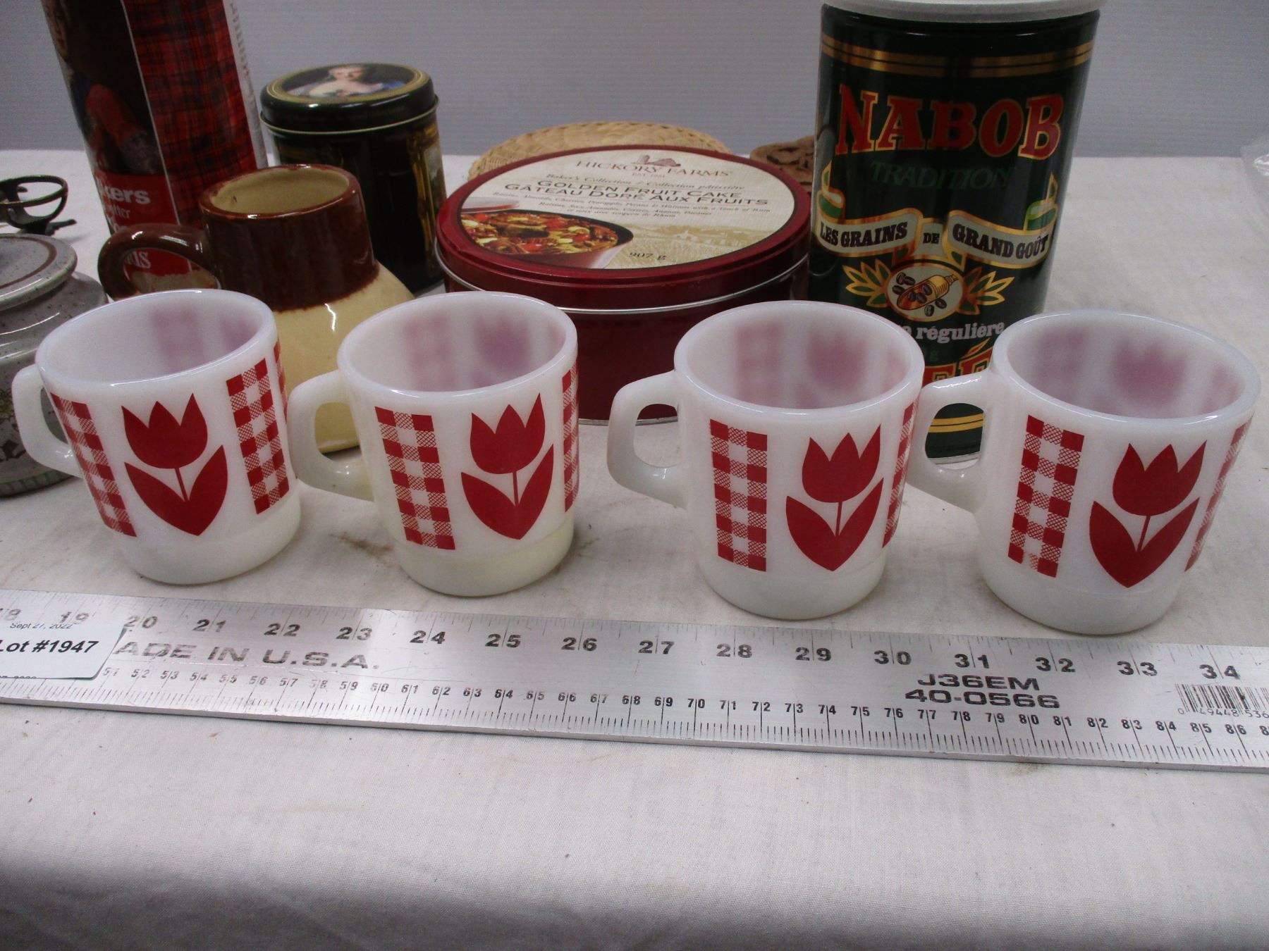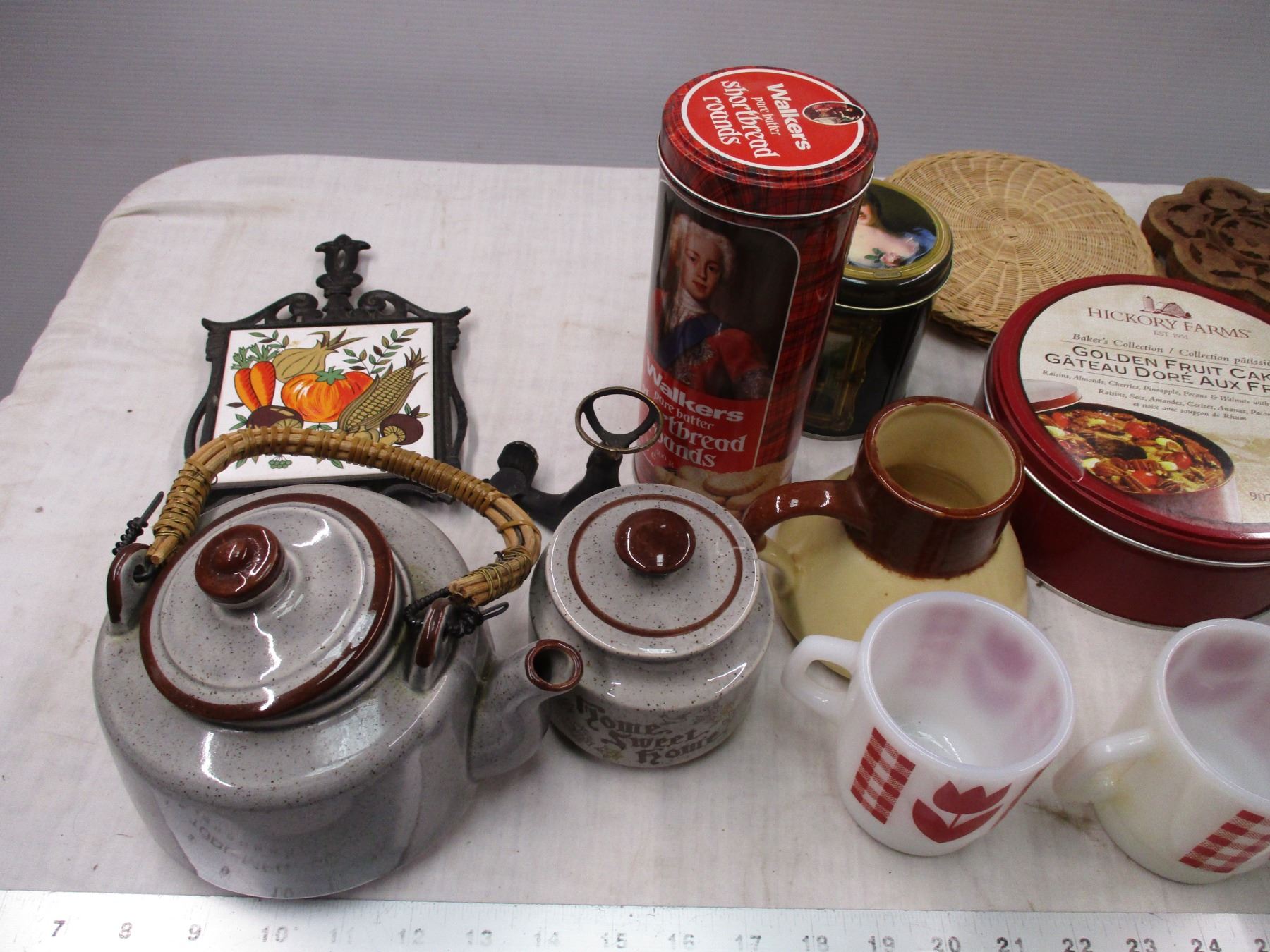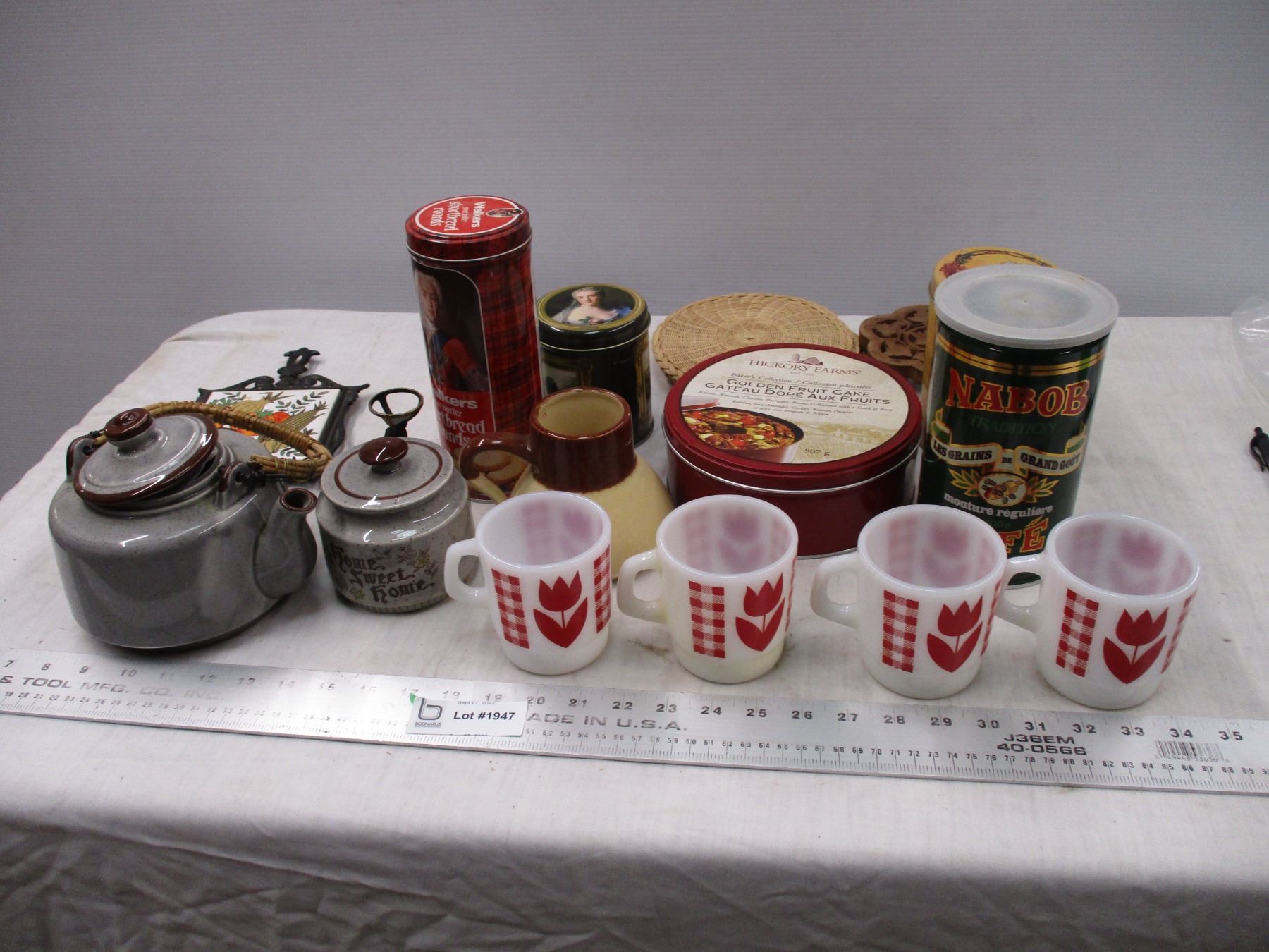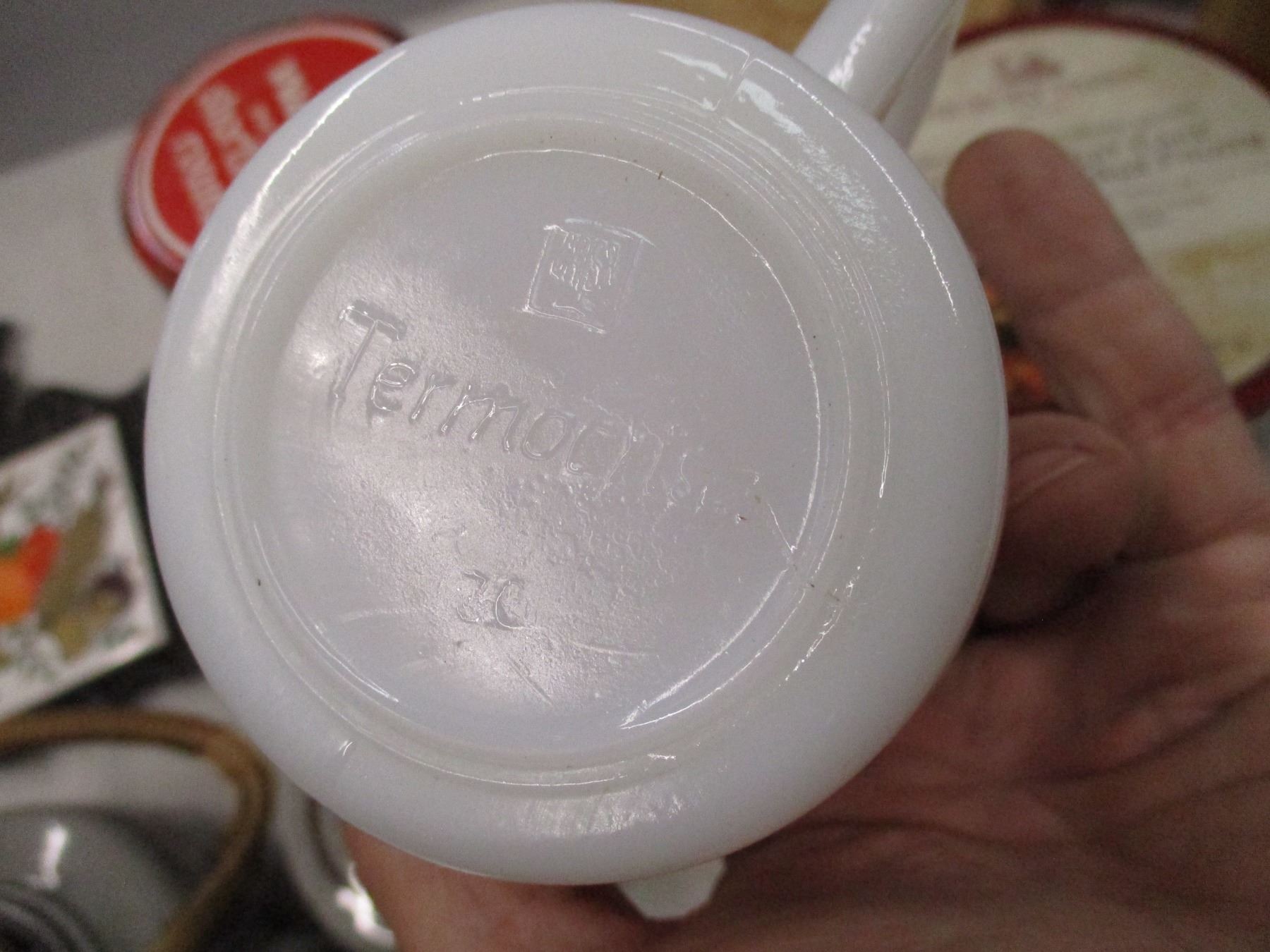 (4) Termocrisa Milk Glass Tulip Mugs, teapot, misc tins