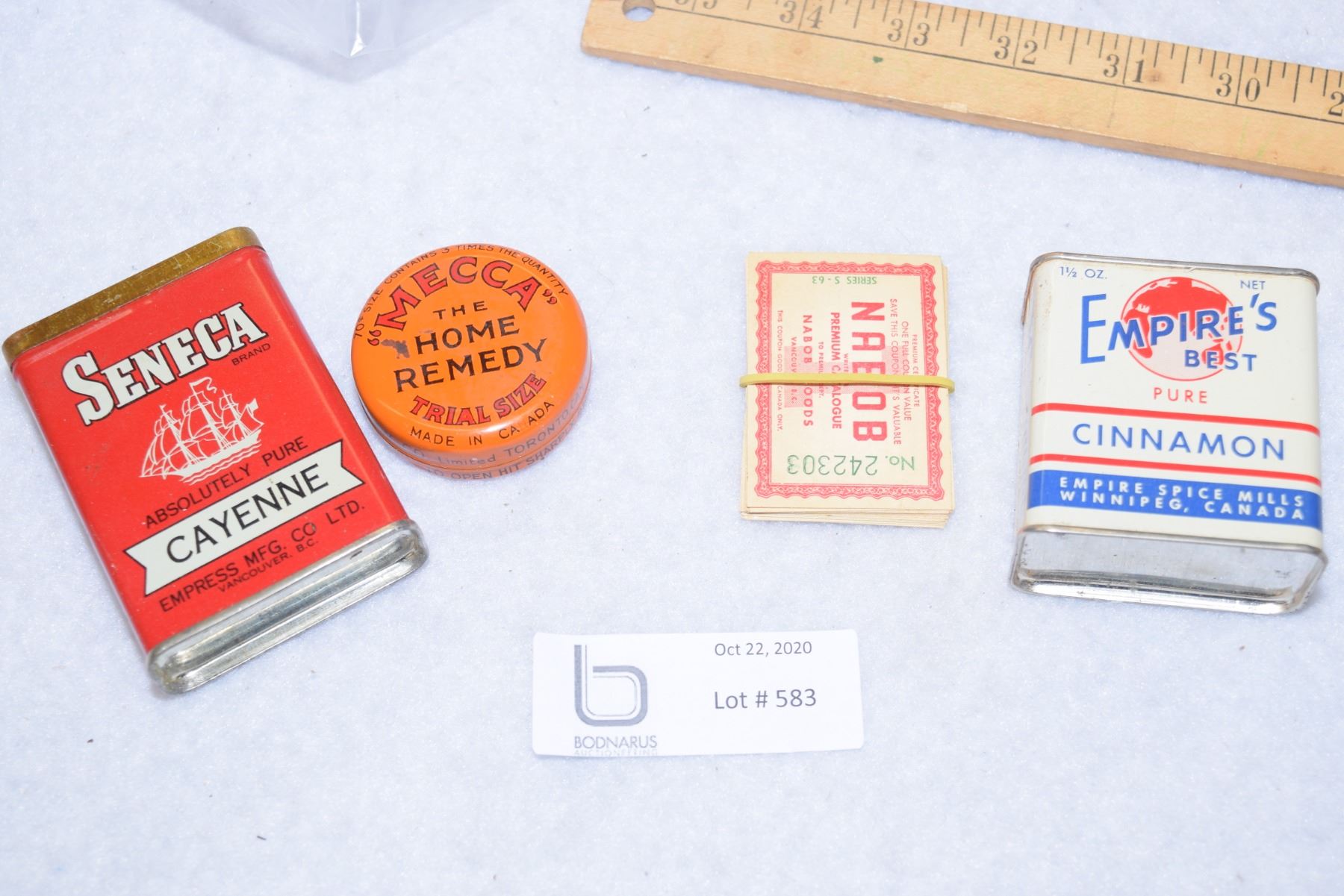 4 Tins: Mecca Ointment, Empire Cinnamon, Seneca Cayenne Pepper, and Nabob Coupons