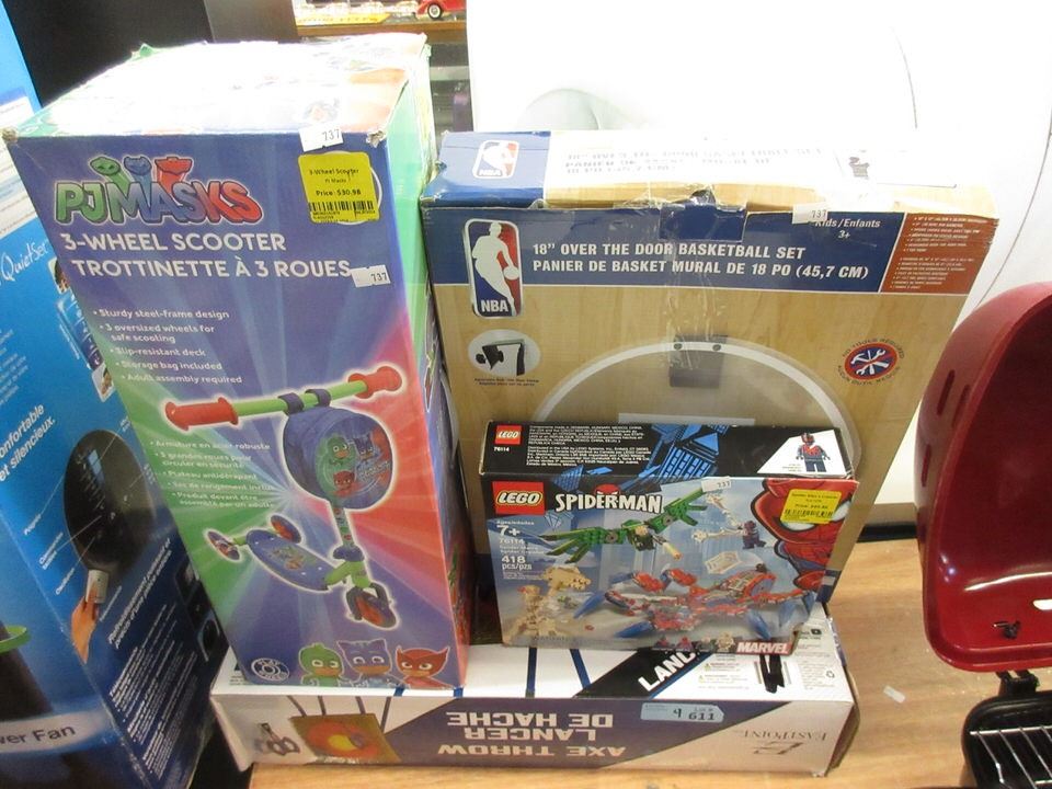 Axe Throw, scooter, over the door basketball & Spider-Man LEGO