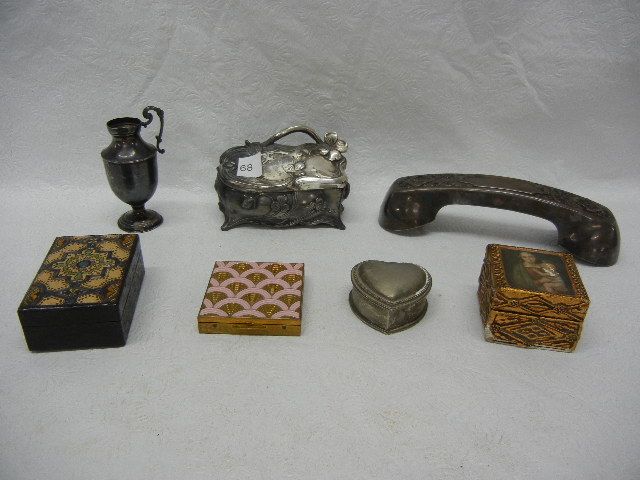 4 Trinket Boxes, Gorham Silver Plated Phone Receiver Cover, 5th Ave. Compact Mirror, and Small Silver Pitcher