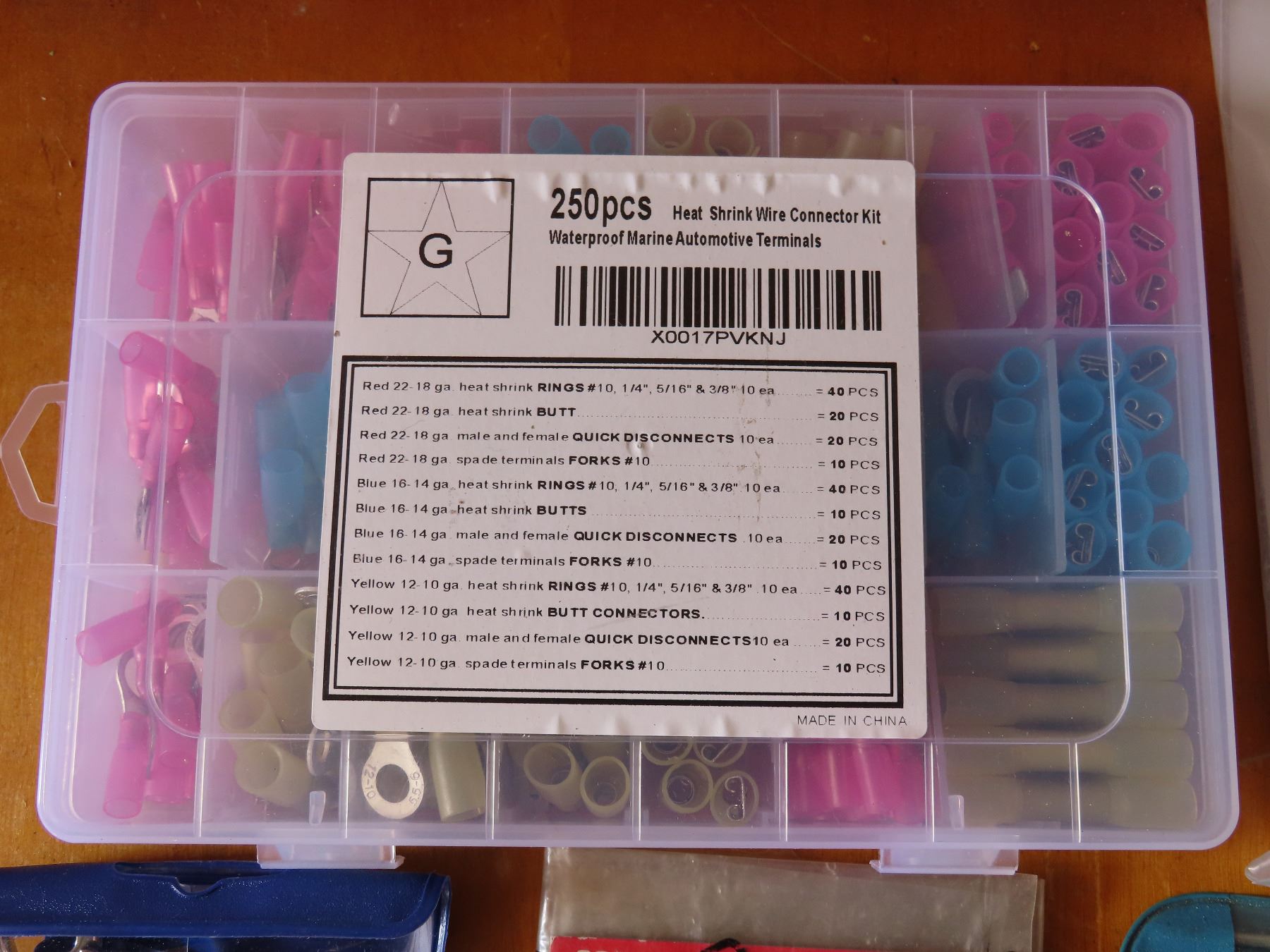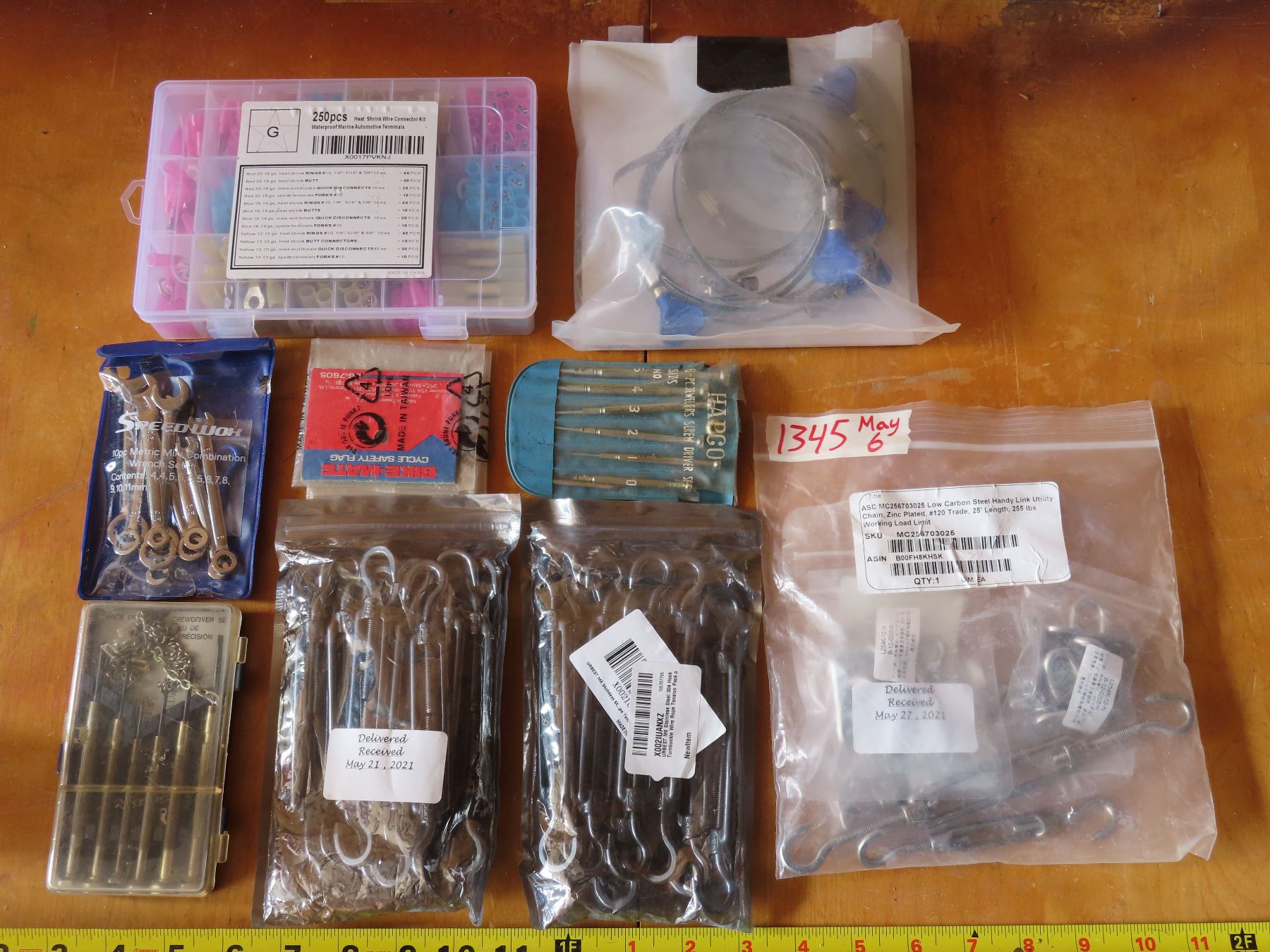 4" Turn Key adjustable hose clamps, Mini wrench & screw driver sets, 250pc heat shrink wire connector kit.