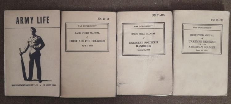 4 US GI WWII MANUALS-UNARMED DEFENSE-1ST AID-ENGINEERS-ARMY LIFE * * NICE ORIG GROUPING * * *