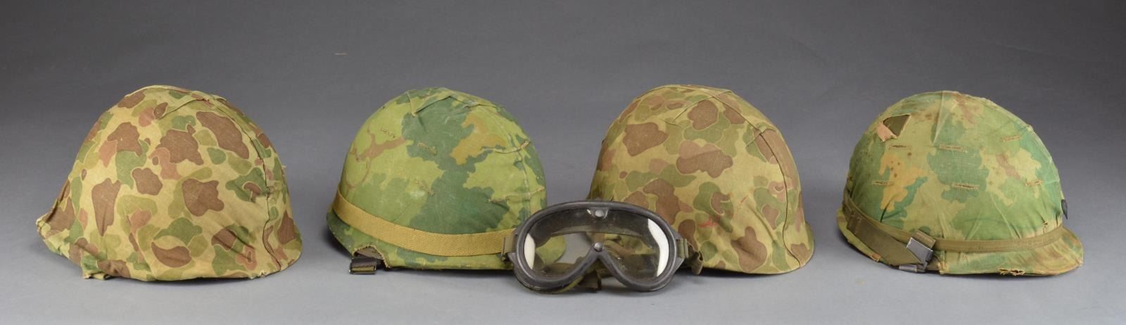 1) Front seam, swivel bail helmet w/ correct WWII liner. Helmet has complete cotton chinstrap & sm. leather interior strap w/ 1 missing clip. Helmet has a camouflage cover. 2) Front seam, swivel bail helmet w/ correct WWII liner. Helmet has complete nylon & cotton chinstrap. Sm. leather interior strap is broken but present. Helmet has a camouflage cover. 3) Front seam, swivel bail helmet w/ correct WWII liner. Helmet has complete cotton chinstrap, no sm. leather interior strap. Helmet has a camouflage cover. 4) Rear seam, swivel bail helmet w/ post WWII liner. Helmet has complete nylon & cotton chinstrap & cotton interior jump straps. Helmet has a camouflage cover. Helmet includes a pair of goggles. CONDITION: camouflage covers are generally intact & undamaged. 1 Has a sm. tear in the top. Liners are generally complete & undamaged. Goggles show moderate wear. (02-13977/BF). $500-700.