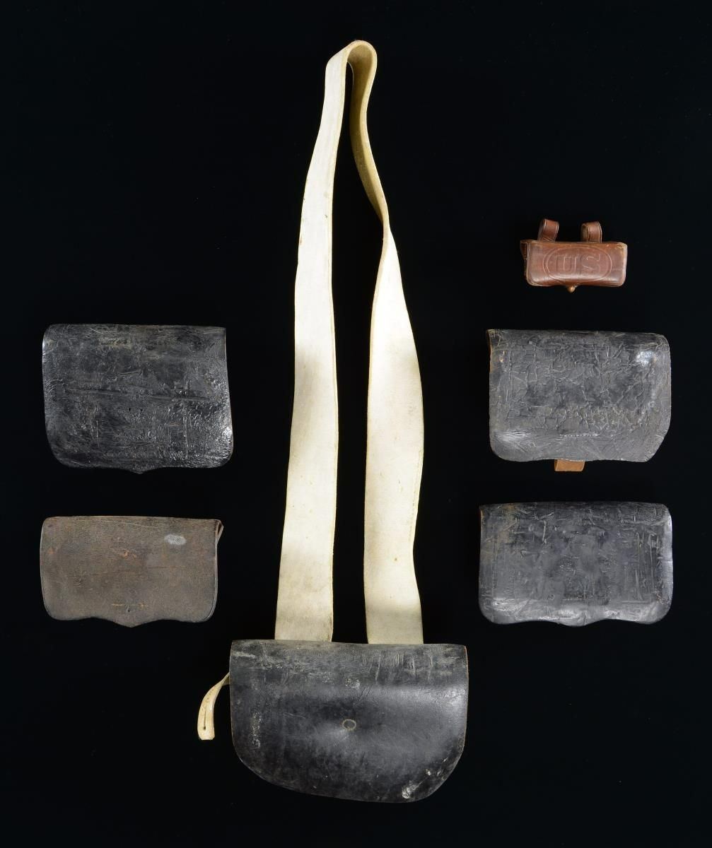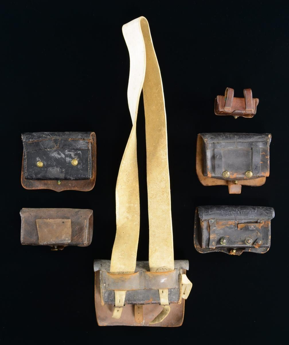 BOX WITH SLING, & 1 M1904 PISTOL BOX. This lot includes 1 militia cartridge box with 2 cuff sized Civil War eagle buttons on the reverse to accept a linen sling. / 1 Militia cartridge box with 2 cuff sized Civil War eagle buttons on the reverse to accept a linen sling. This box has a tin insert and a missing plate from the front. / 1 Militia cartridge box with 2 small brass studs on the reverse to accept a linen sling. / 1 Small militia cartridge box with a tin insert. Box has a detached belt loop & broken attachment thong. / 1 M1904 pistol cartridge box marked on the reverse “ROCK ISLAND ARSENAL 1908. H.E.K.”. / 1 French cartridge box dating from 1840 to 1860 with a wood insert and a white buff leather over-the-shoulder strap that buckles on the base of the cartridge box. CONDITION: all boxes show moderate wear but are complete except as noted. (02-20147/BF). $600-900.