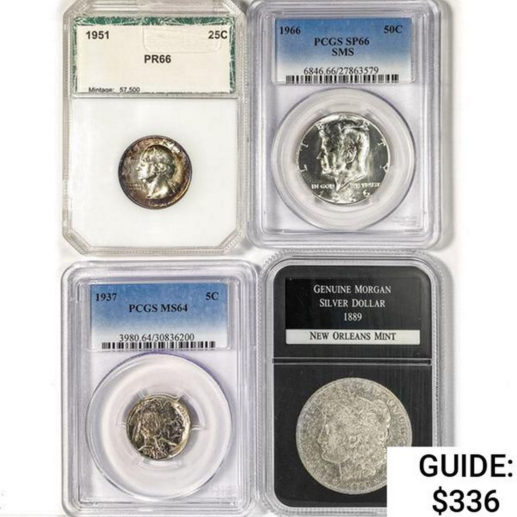 COINS AND CURRENCY LISTED IN GSA'S CATALOG AS GRADED AND ENCAPSULATED BY PCGS, NGC, ANACS, ICG, PCGS CURRENCY, PMG, PCGS BANKNOTE GRADING, CMC OR ANY OTHER THIRD-PARTY GRADING SERVICE ARE LIKEWISE SOLD "AS-IS" EXCEPT AS EXPRESSLY SET FORTH HEREIN. ALL THIRD-PARTY GRADING SERVICE GUARANTEES, INCLUDING AUTHENTICITY, ARE THE SOLE RESPONSIBILITY OF THE THIRD-PARTY GRADING SERVICE AND NOT WARRANTIES OR GUARANTEES OF GSA. BIDDERS SHOULD CONTACT THESE THIRD-PARTY GRADING SERVICES DIRECTLY WITH RESPECT TO ANY CLAIMS OR QUESTIONS THEY MAY HAVE CONCERNING THEIR GUARANTEES AND WARRANTIES. BIDDERS ACKNOWLEDGE AND AGREE THAT AUCTIONEER IS NOT BOUND BY OR LIABLE FOR ANY OPINION OR CERTIFICATION BY ANY THIRD-PARTY GRADING SERVICE. REMOVAL OF A PRODUCT FROM ITS PROTECTIVE CASING OR HOLDER OR ALTERATION OF ANY COIN HOLDER WAIVES ALL RIGHTS CONCERNING THE PRODUCT CONTAINED THEREIN.
