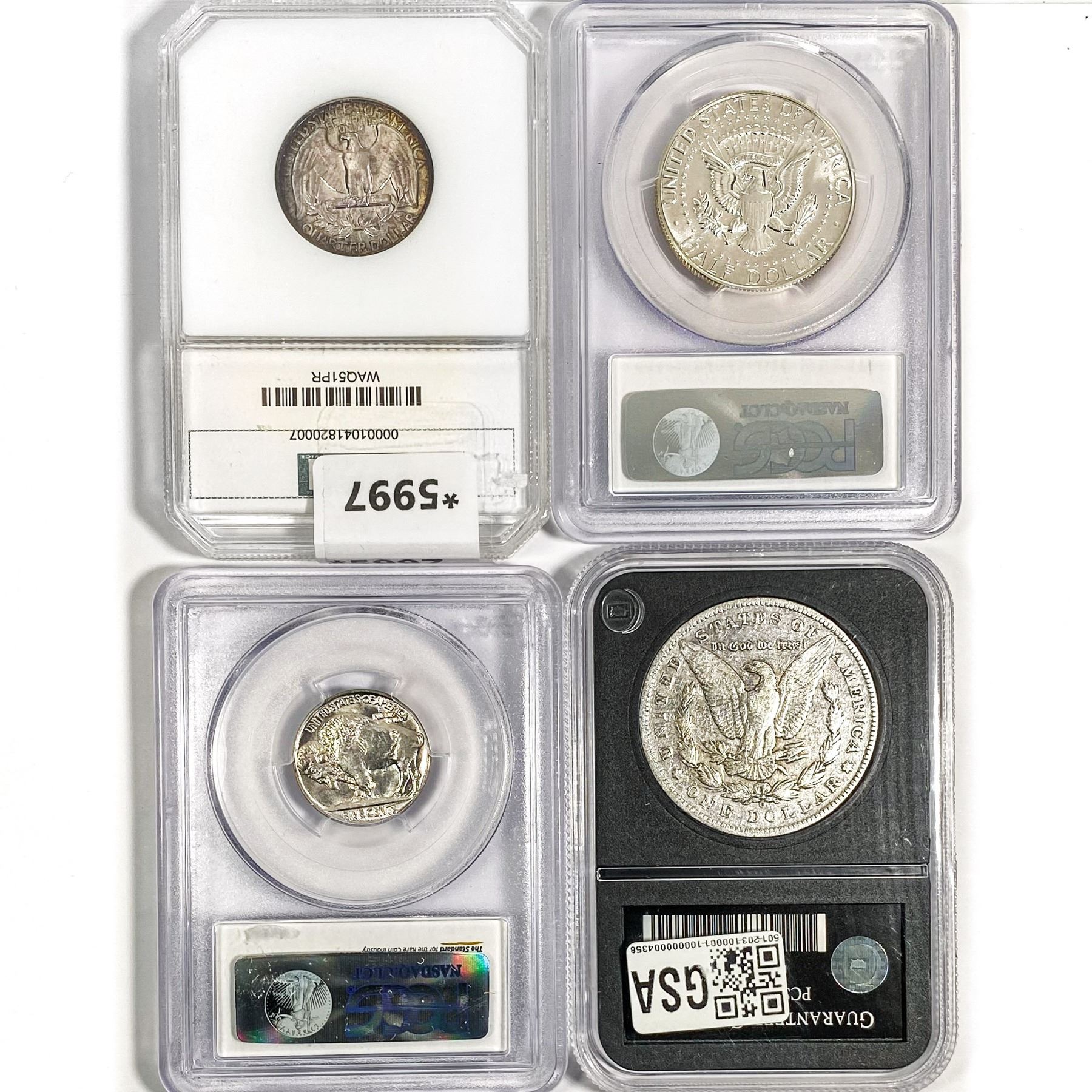 COINS AND CURRENCY LISTED IN GSA’S CATALOG AS GRADED AND ENCAPSULATED BY PCGS, NGC, ANACS, ICG, PCGS CURRENCY, PMG, PCGS BANKNOTE GRADING, CMC OR ANY OTHER THIRD-PARTY GRADING SERVICE ARE LIKEWISE SOLD “AS-IS” EXCEPT AS EXPRESSLY SET FORTH HEREIN. ALL THIRD-PARTY GRADING SERVICE GUARANTEES, INCLUDING AUTHENTICITY, ARE THE SOLE RESPONSIBILITY OF THE THIRD-PARTY GRADING SERVICE AND NOT WARRANTIES OR GUARANTEES OF GSA. BIDDERS SHOULD CONTACT THESE THIRD-PARTY GRADING SERVICES DIRECTLY WITH RESPECT TO ANY CLAIMS OR QUESTIONS THEY MAY HAVE CONCERNING THEIR GUARANTEES AND WARRANTIES. BIDDERS ACKNOWLEDGE AND AGREE THAT AUCTIONEER IS NOT BOUND BY OR LIABLE FOR ANY OPINION OR CERTIFICATION BY ANY THIRD-PARTY GRADING SERVICE. REMOVAL OF A PRODUCT FROM ITS PROTECTIVE CASING OR HOLDER OR ALTERATION OF ANY COIN HOLDER WAIVES ALL RIGHTS CONCERNING THE PRODUCT CONTAINED THEREIN.