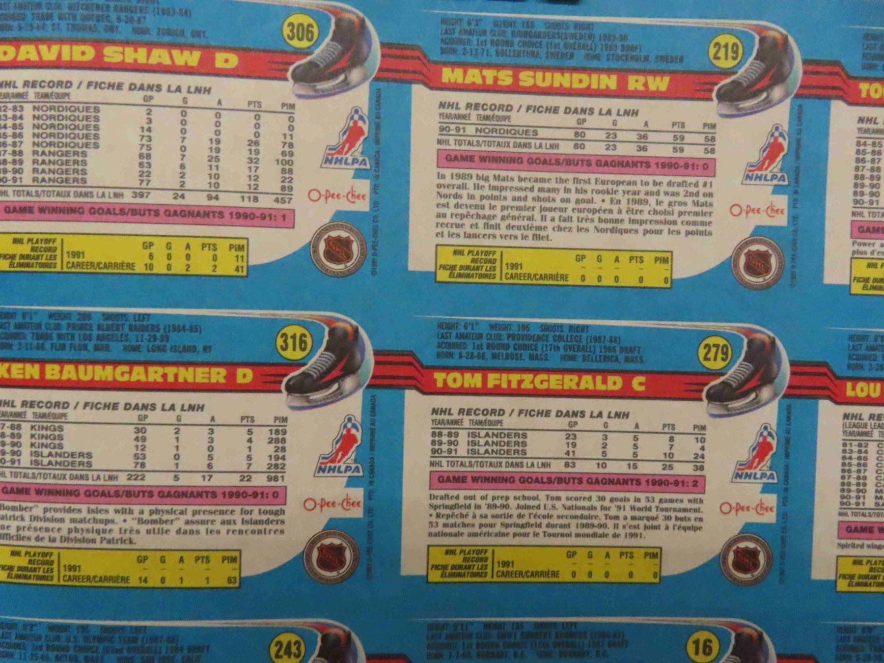 4 Uncut Hockey Card Sheets 1991/92 O Pee Chee, Full Sheet, 528 Cards