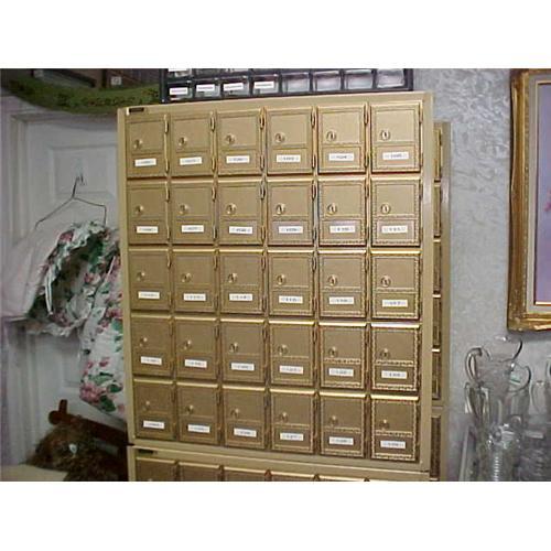 4 Unit Salsbury Post Office Boxes. Brass fronts, no glass. Opens in back. 3 units have 30 boxes each and 1 unit has 16 larger boxes. Really nice condition and the keys are in a numbered box. Note! There are 2 units like the one pictured all for one price.