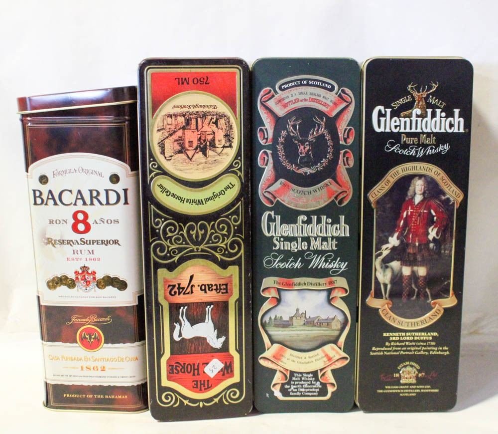 4 VARIOUS WHISKEY RUM TINS EMPTY