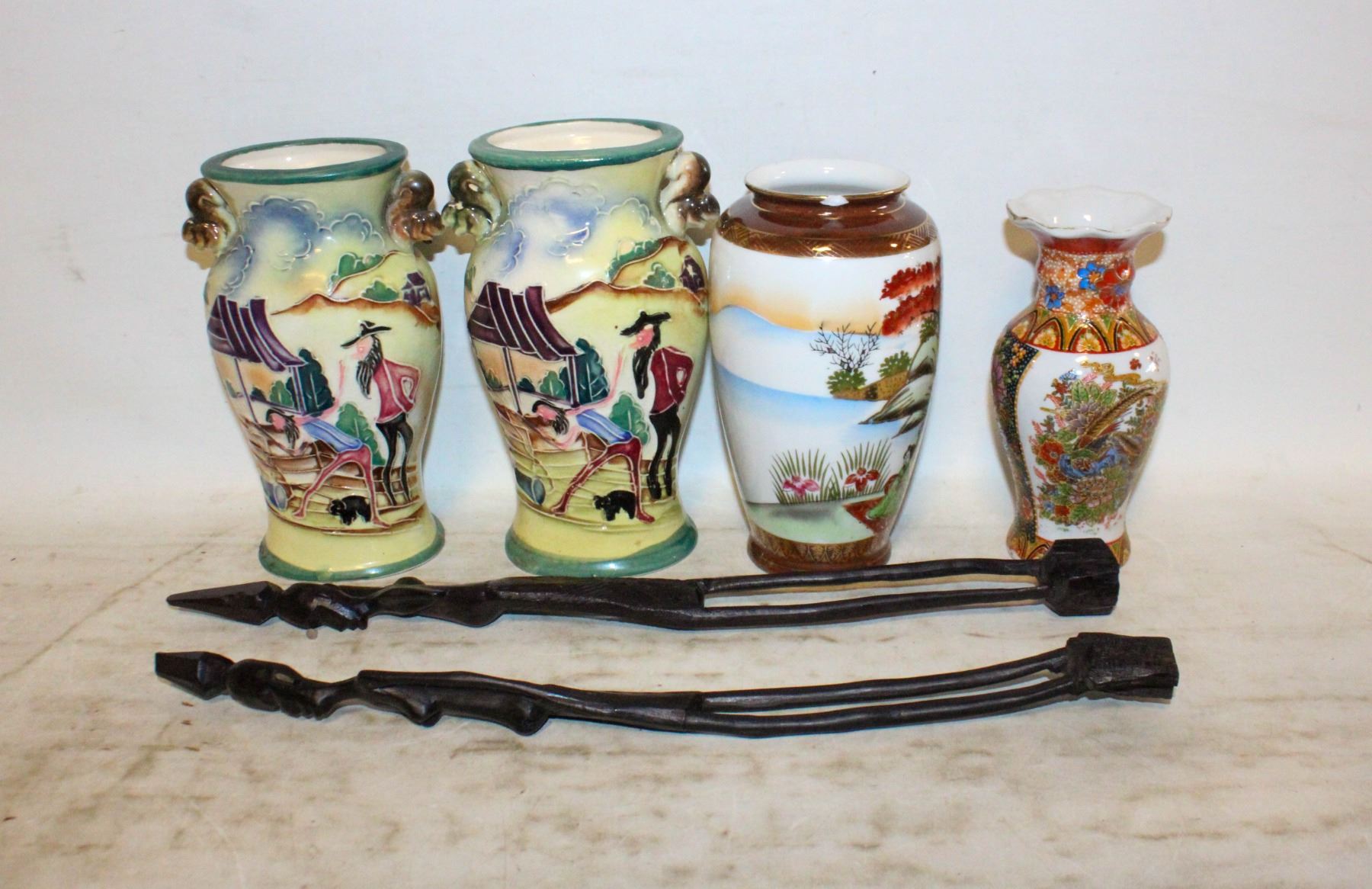 4 VASES + 2 WOODEN CARVED FIGURES