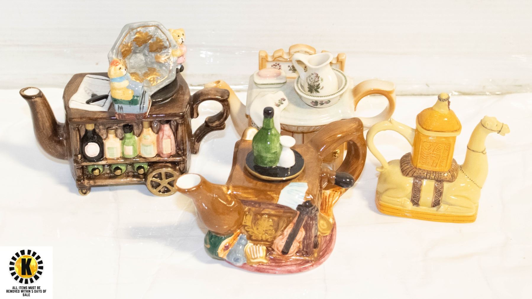 4 VINTAGE DECOR TEAPOTS WITH REMOVABLE DECOR LIDS