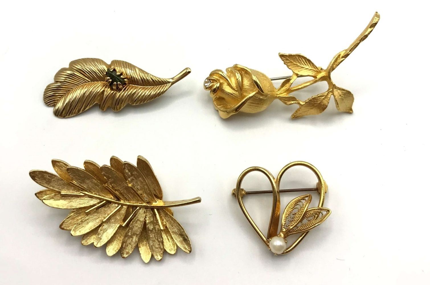 LEAF-HEART-BROOCH-FILIGREE ACCENTS-FAUX PEARL-GREEN STONE ACCENT