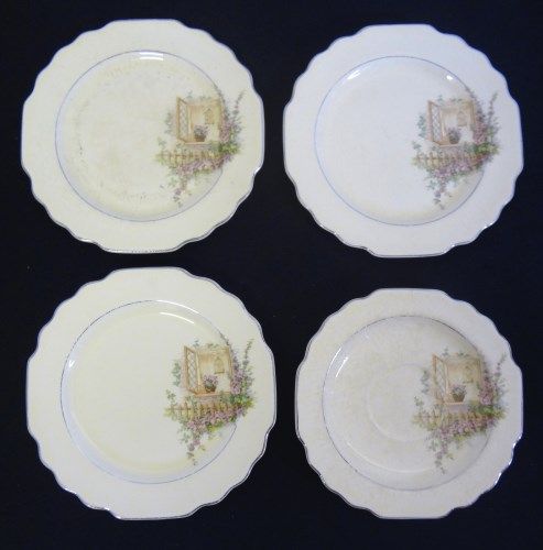 1 6" SAUCER PLATE THAT MATCHES 3 7" PLATES. THE DESIGN IS A WINDOW SCENE WITH FLOWERS. VERY PRETTY. MARKING SAY LIDO W.S. GEORGE CANARYTONE, MADE IN U.S.A. 136A. Est Value $10.00-20.00