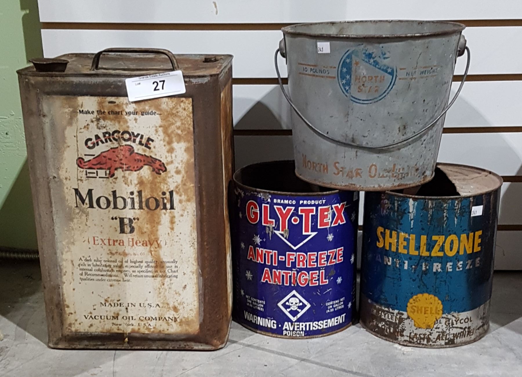 GARGOYLE MOBILEOIL "B" VACUUM OIL, GLY-TEX AND SHELLZONE ANTIFREEZE GALLON TINS AND NORTHSTAR 10LB OIL PAIL