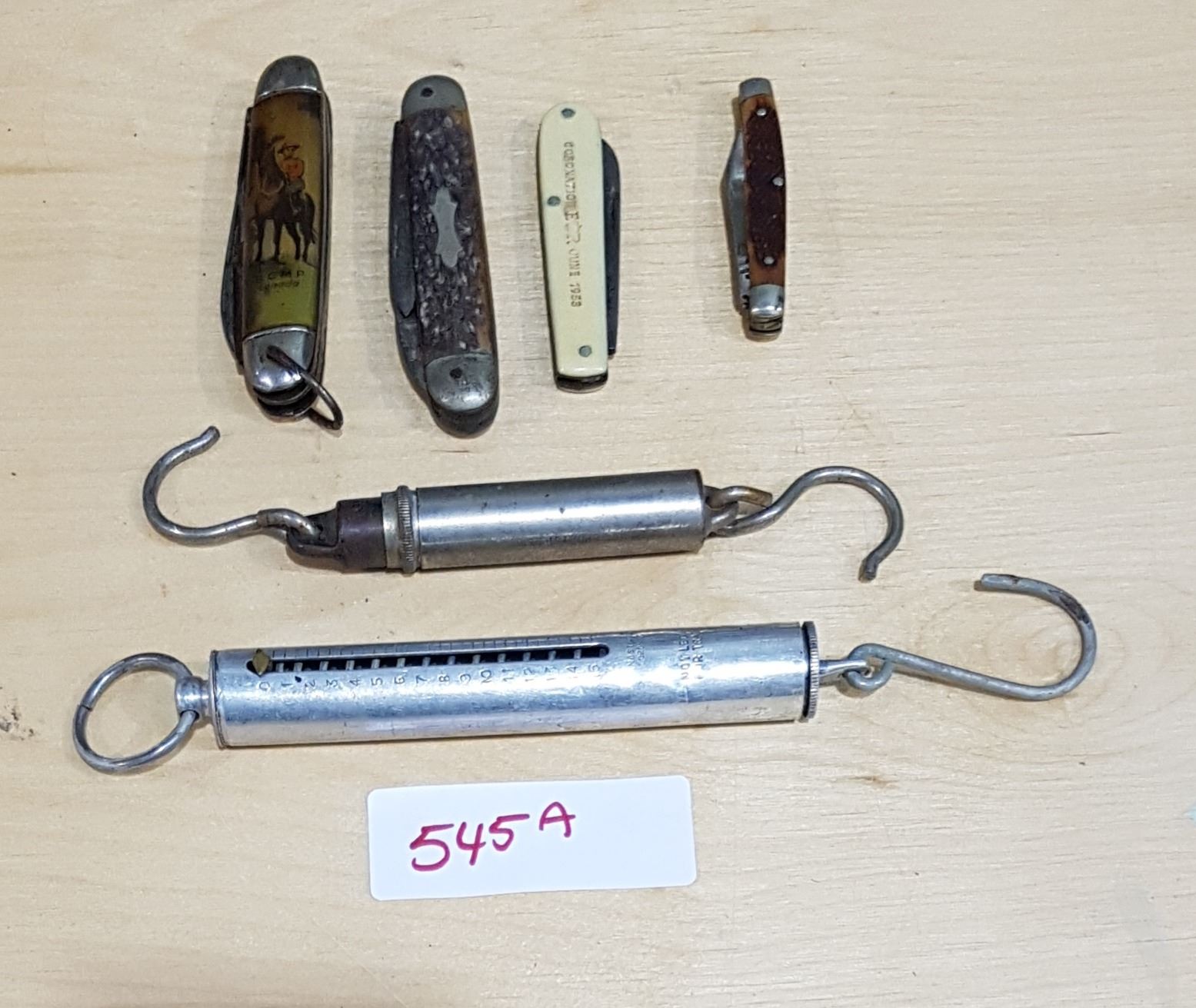 4 VINTAGE POCKET KNIVES & 2 VINTAGE SPRING SCALES