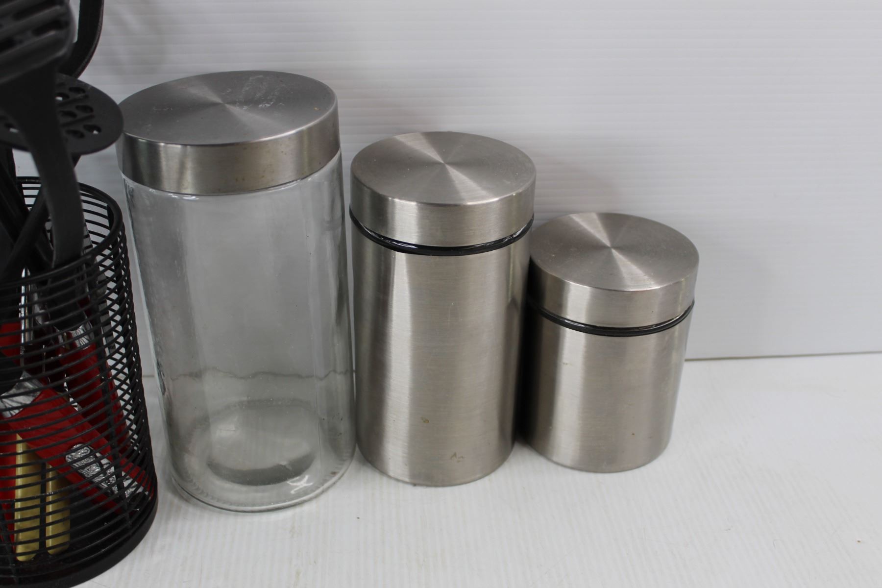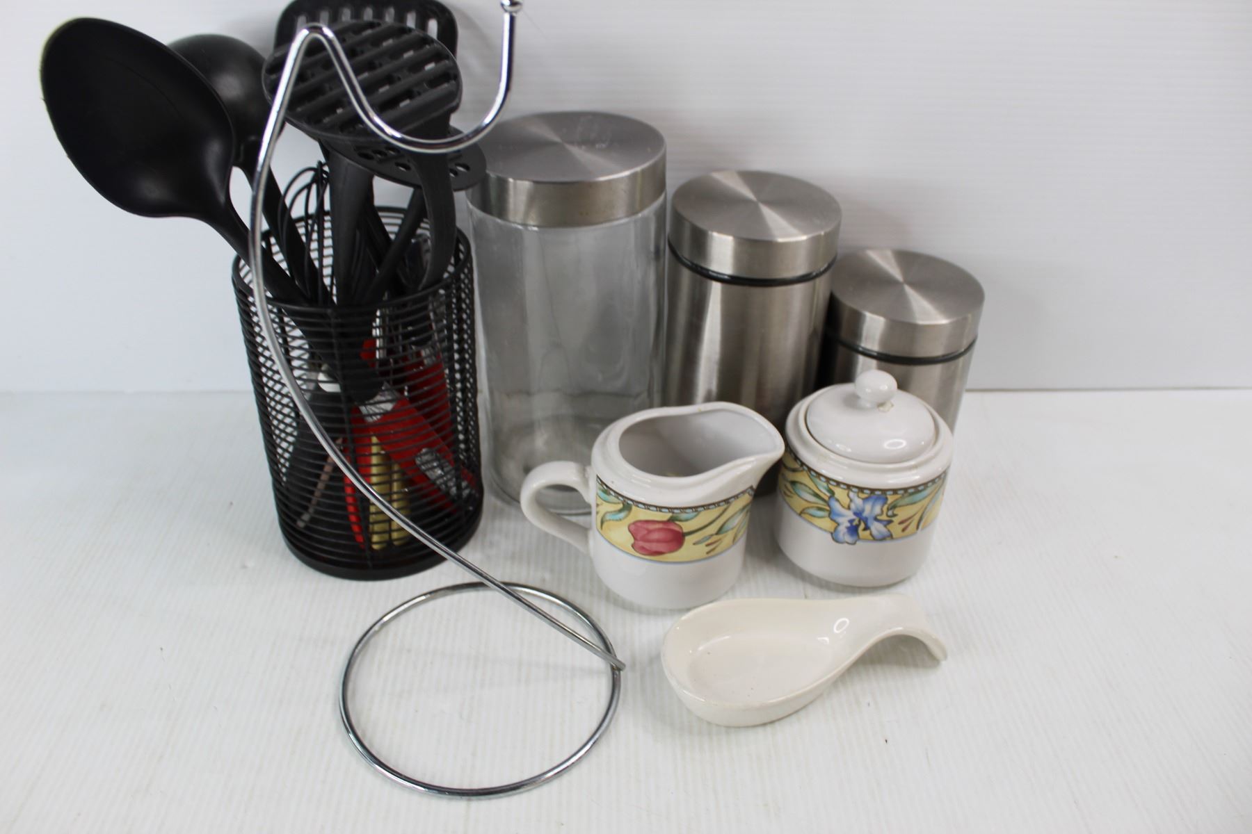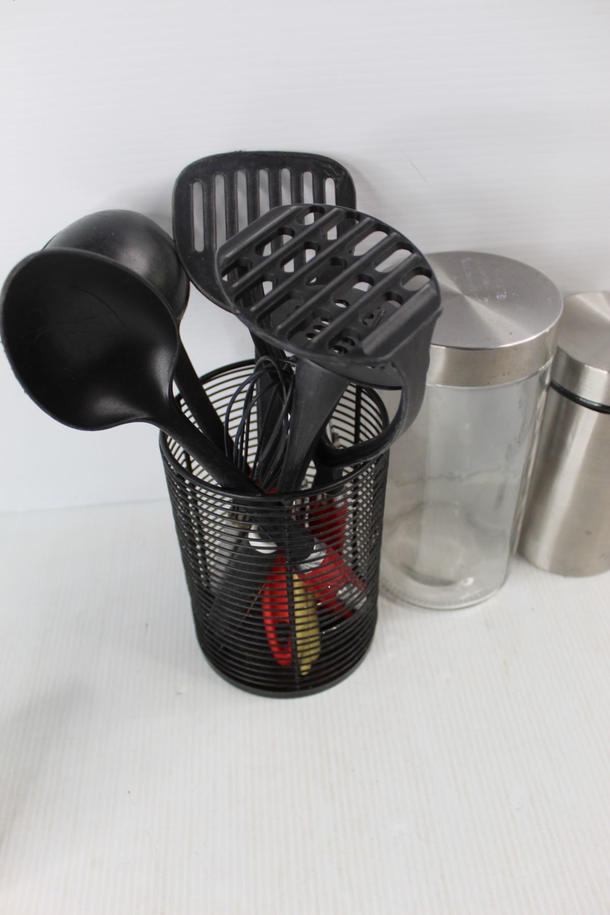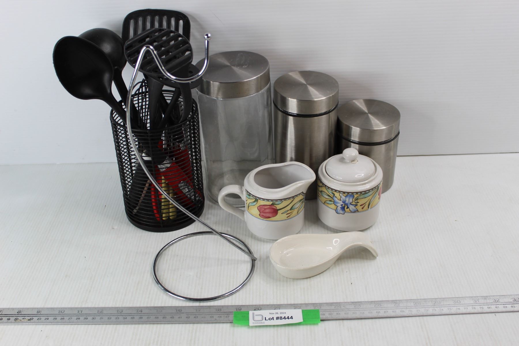 (4) Various Food Canisters/ Sugar Containers, (6) Various Cooking Utensils, Soup Ladles, Potato Masher, Misc.