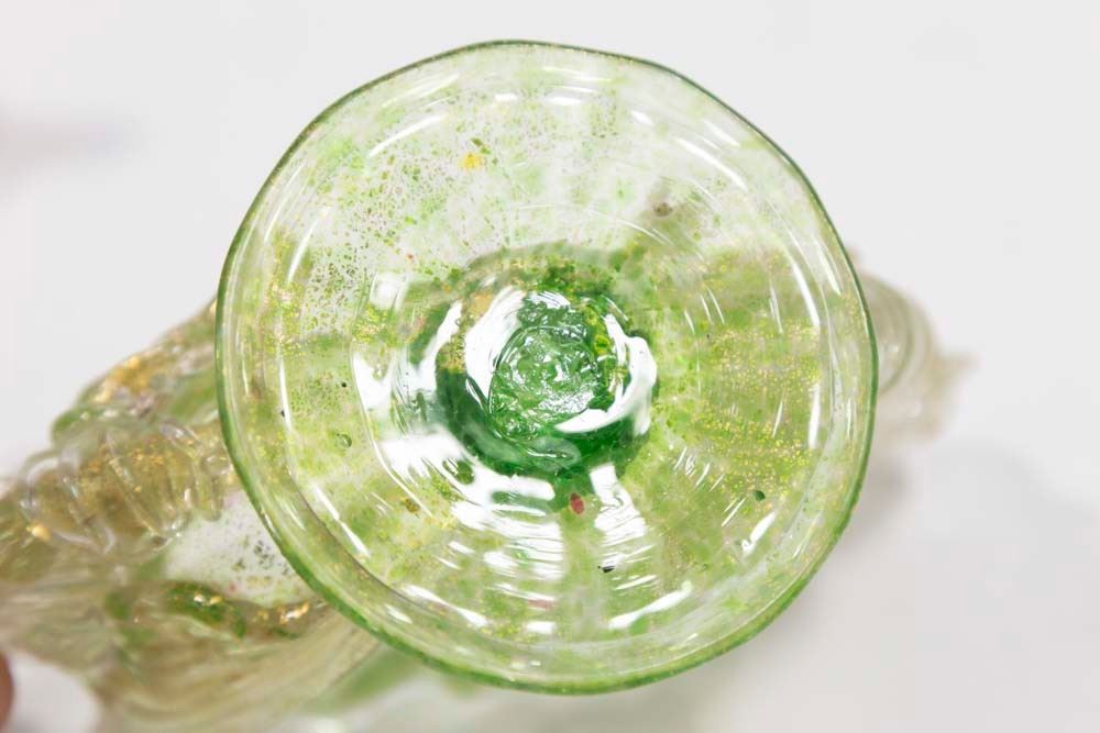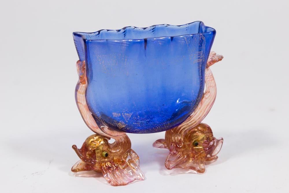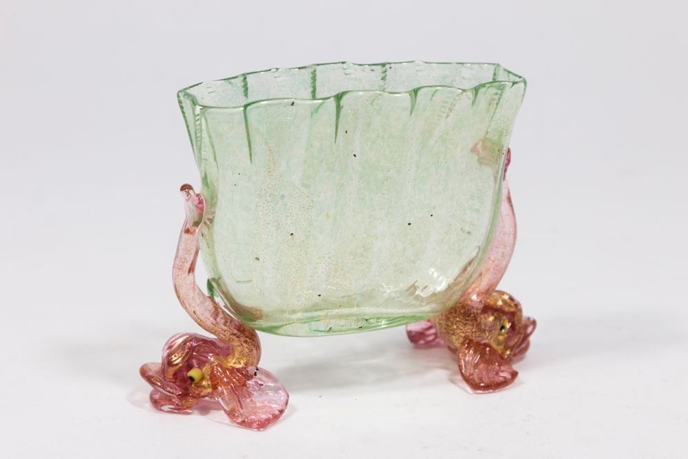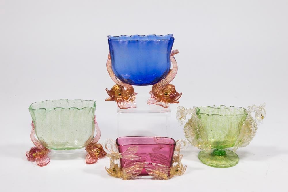 Late 19th/early 20th century. Attributed to Salviati & C. Artisti Barovier or Fratelli Toso. 3 dolphins, 1 dragon. Sizes approx. 2" H x 4 1/2" W - 4" H x 4 1/4" W. From a NY estate. (6092) Blue holder - line on body of one dolphin that doesn't go through to the other side. Lime green holder - chip on wing.