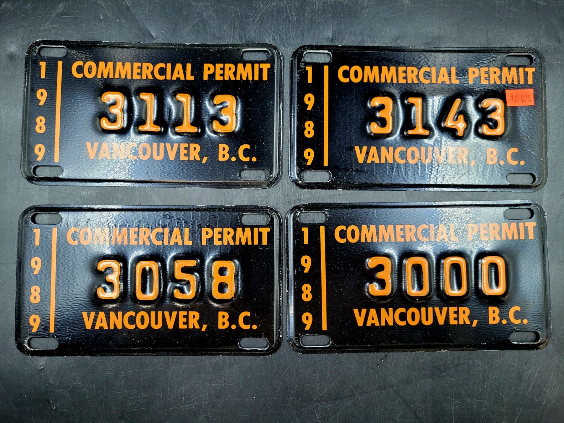 4 Vintage 89' Vancouver, B.C Commercial Permit License Plates