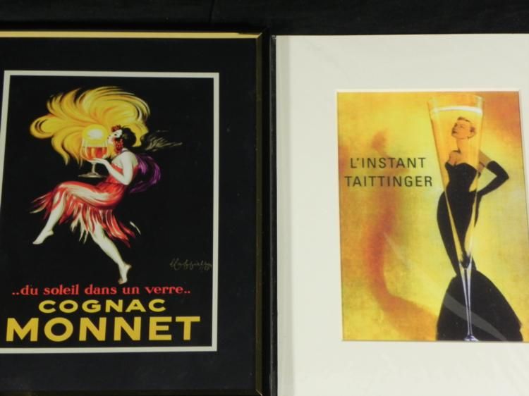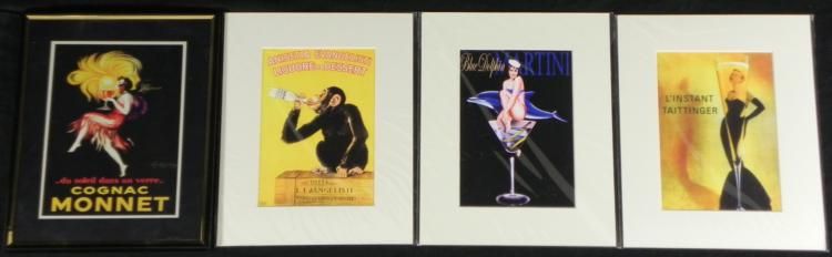 These are four reproductions of vintage advertising posters, originally dating from the 1920-40's.Medium: Prints on paperPresentation: 3 are matted and sealed in plastic, and one is framed in black and gold metal frameOverall sizes: 8 x 10 inchesCondition: ExcellentPrints: * Cognac Monnet, by artist Leonetto Cappiello, circa 1927 (framed)Grace Kelly in Taittinger ChampagneBlue Dolphin Martini, by Ralph BurchAnisetta Evangelisti dessert liquor, by Carlo Biscaretti, circa 1925