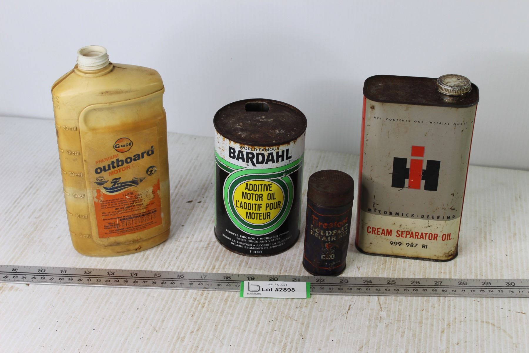 (4) Vintage Cans - IH Cream Separator Oil - Bardahl Additive - Gulf Outboard Oil - Firestone Tire Kit