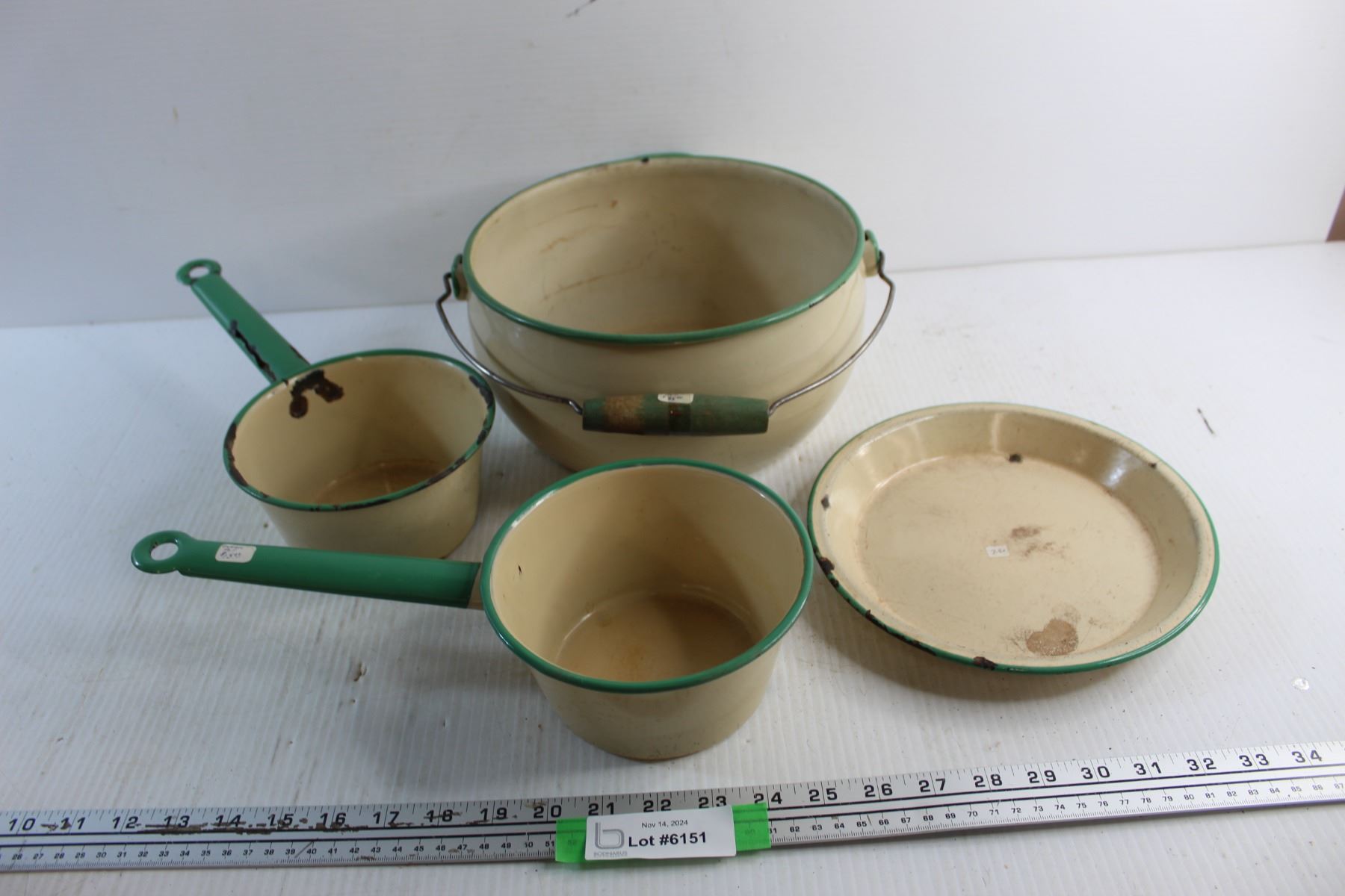 (4) Vintage Enamel Ware Pieces, Potato Pot, Plate, Misc.