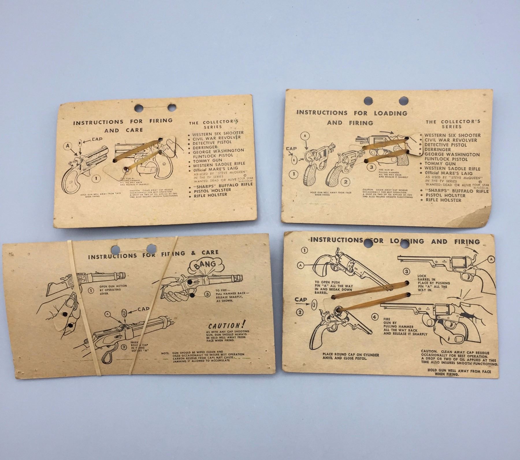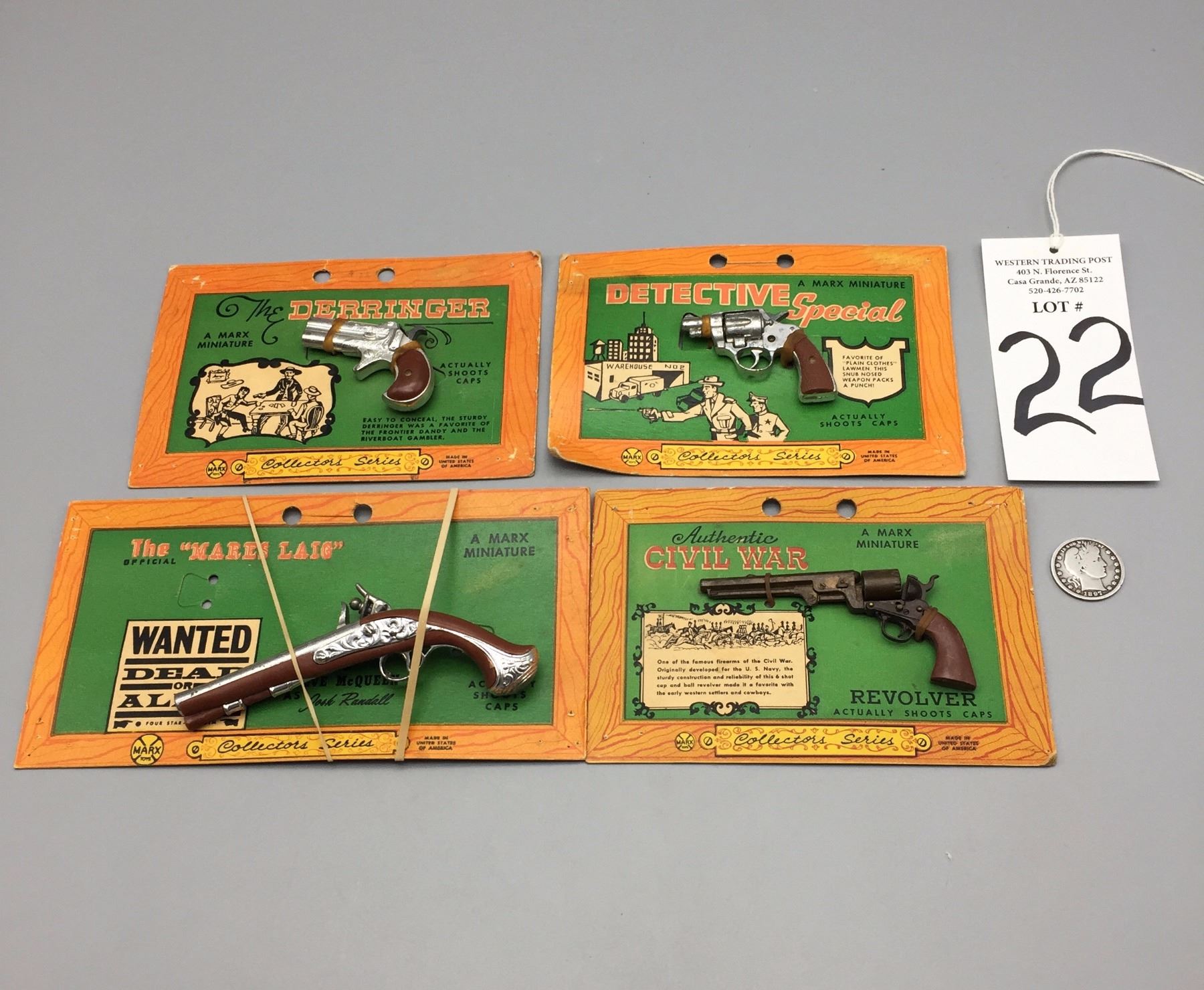 Maker: Marx Toy Company.                                                                                                                     Approx. Age: Vintage (Circa mid-century).                                                                                                             Size: Guns vary from 2 1/4” to 4 3/4” long (not including cards).                                                                                                                                                                                                                                  Additional Info: Collectors Series Marx Cap Guns with original packaging. Louis Marx and Company was founded in 1919 by toy salesman Louis Marx and brother David Marx of New York, NY. During the 1940s — 60s Marx produced may outstanding toy cap guns. Louis Marx sold his toy company in 1972.                                                                                              Condition: Good for their ages but the packages do show a little age.                                                                                                                   Please look closely at the pictures - they are an important part of our description.                                Shipping: There will be a $7 handling / packaging fee for shipping this lot. The actual cost of postage will be added on top of that.