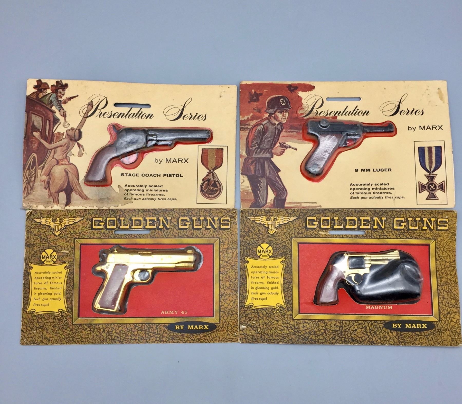 Maker: Marx Toy Company. Approx. Age: Vintage (Circa mid-century). Size: Guns vary from 3” to 4.5” long (not including cards). Additional Info: Collectors Series Marx Cap Guns with original packaging. Louis Marx and Company was founded in 1919 by toy salesman Louis Marx and brother David Marx of New York, NY. During the 1940s — 60s Marx produced may outstanding toy cap guns. Louis Marx sold his toy company in 1972. Condition: Good for their ages but the packages do show a little age. Please look closely at the pictures - they are an important part of our description. Shipping: There will be a $7 handling / packaging fee for shipping this lot. The actual cost of postage will be added on top of that.