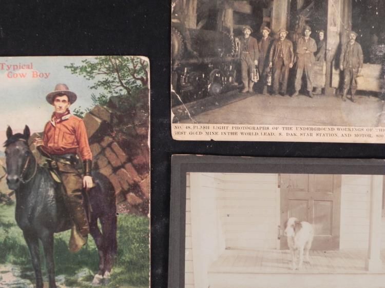These are 4 vintage photographs. One 8 x 10 photo depicts an oil field at Pioneer Run Creek, circa 1865. Another is a 4 x 5 picture of the family dog outside on the front porch, on card backing. One postcard shows miners in the Homestake, the largest gold mine in the world. The other postcard has a color illustration of a cowboy, with writing on back. Three of these pictures have wear and tears, but are still in decent condition for an album or scrapbook.