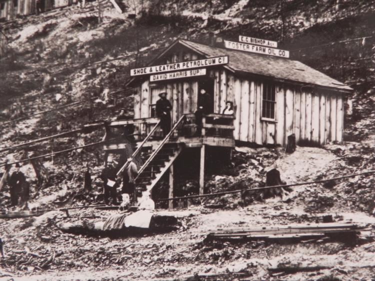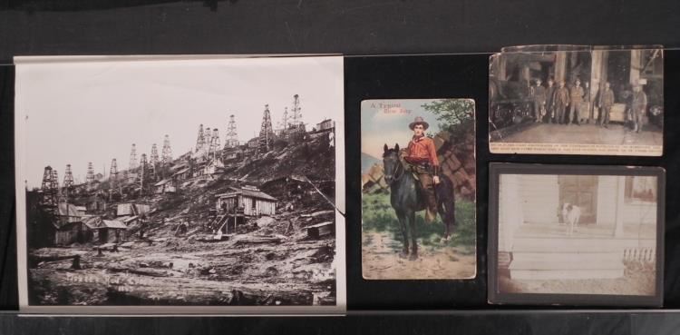 These are 4 vintage photographs. One 8 x 10 photo depicts an oil field at Pioneer Run Creek, circa 1865. Another is a 4 x 5 picture of the family dog outside on the front porch, on card backing. One postcard shows miners in the Homestake, the largest gold mine in the world. The other postcard has a color illustration of a cowboy, with writing on back. Three of these pictures have wear and tears, but are still in decent condition for an album or scrapbook.