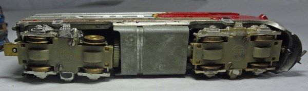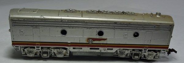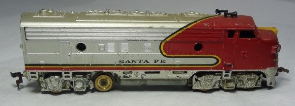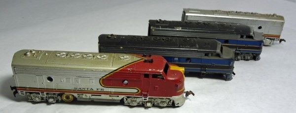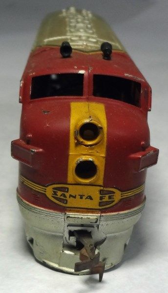 2 cars match each other. They are red, gray, and yellow and head car says Sante Fe. The other 2 are duplicates of each other. Both are head cars but one is missing its wheels.