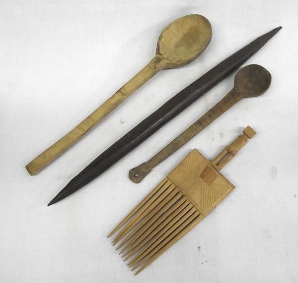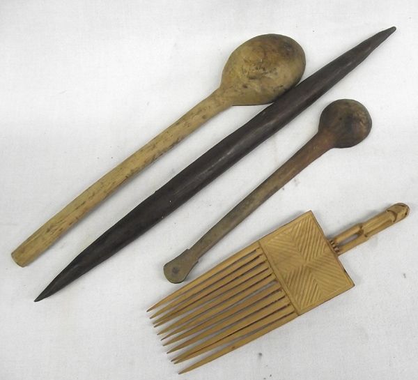 Vintage Wooden Tools. This collection includes 2 spoons, a weavers comb/beater and a misc. piece that could be a weavers bobbin. The largest item measures approx. 17.5'' long.