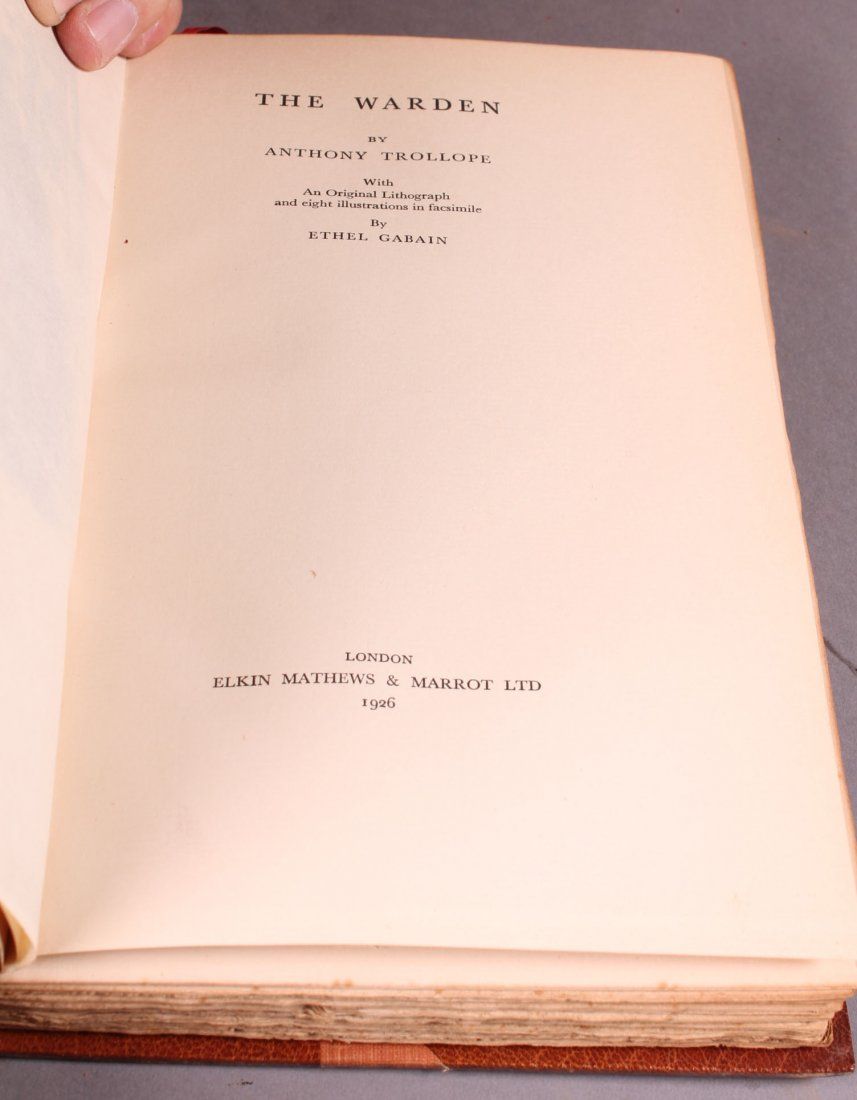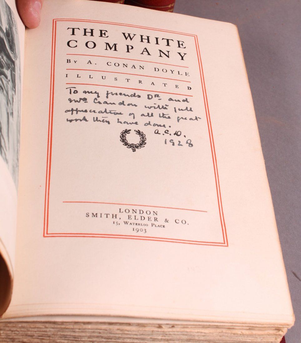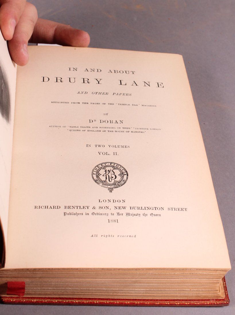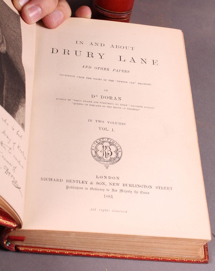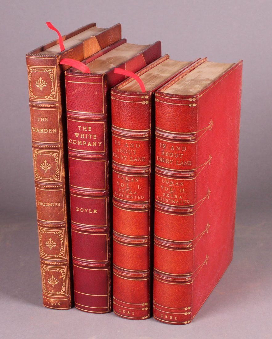 [British Literature/Extra-Illustration]. 3 Titles (4 Vols), 2 vols extra-illustrated. ++ Dr. Doran. IN AND ABOUT DRURY LANE and other Papers reprinted from the pages of ?Temple Bar? Magazine. 2 Vols. Lon: Richard Bentley & Son, 1881. 8vo. Full orange morocco by Charles E. Lauriat & Co., Boston, teg, marbled eps, gilt rules at edges of covers. Very good. Extra-illustrated, approximately 60 plates in all, various engravings, lithographs, and photogravures, mostly portraits of historical figures (mosty from Britain). ++ A. [Arthur] Conan Doyle. THE WHITE COMPANY. Lon: Smith, Elder & Co., 1903. 8vo. Half maroon morocco and cloth, teg. Very good. Upper portions of spine & covers sunned. Title has ink gift inscription. (The ?ACD? initials are those of a previous owner.) ++ Anthony Doyle. THE WARDEN. Lon: Elkin Matthews & Marrot, 1926. 8vo. Half morocco and cloth by Bayntun (Bath, England). Near fine except for sunning to spine and outer portions of covers.