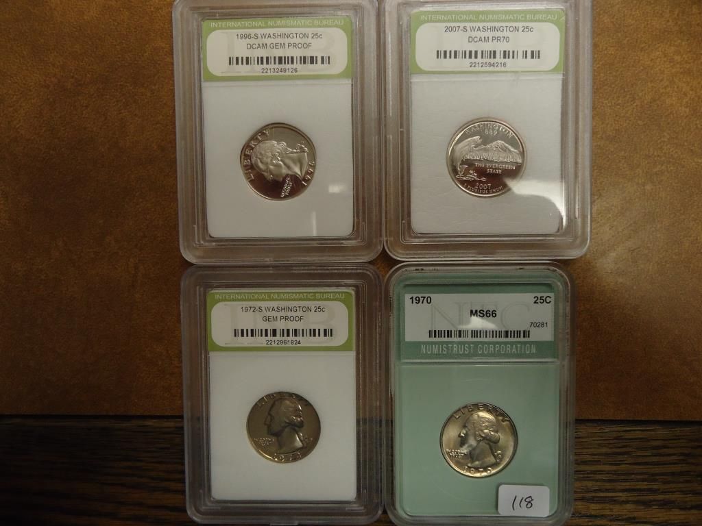 1970 NTC MS66, 1972-S INB GEM PROOF, 1996-S INB GEM PROOF DEEP CAMEO AND 2007-S INB PR70 DEEP CAMEO