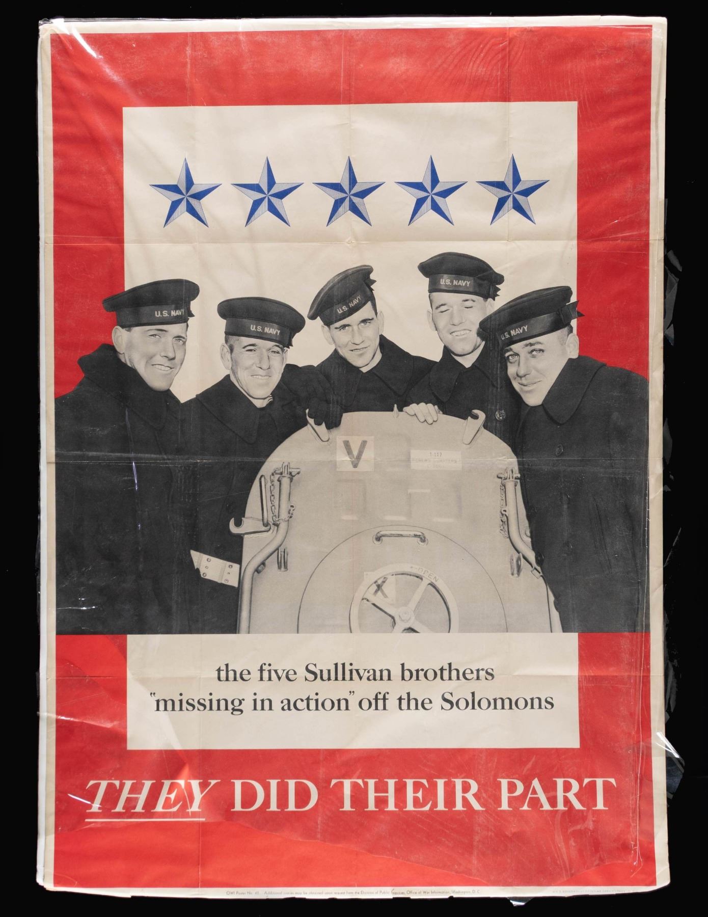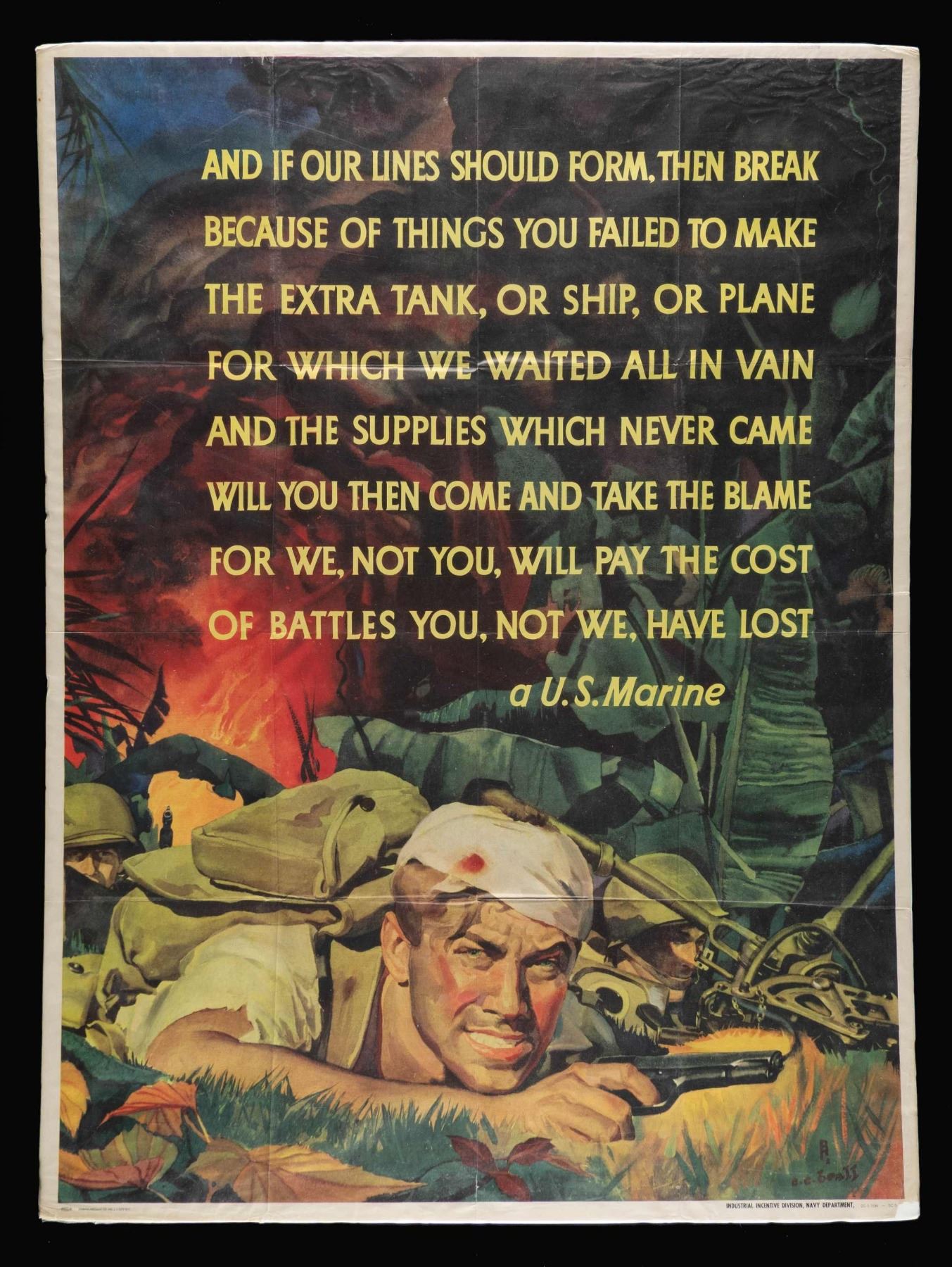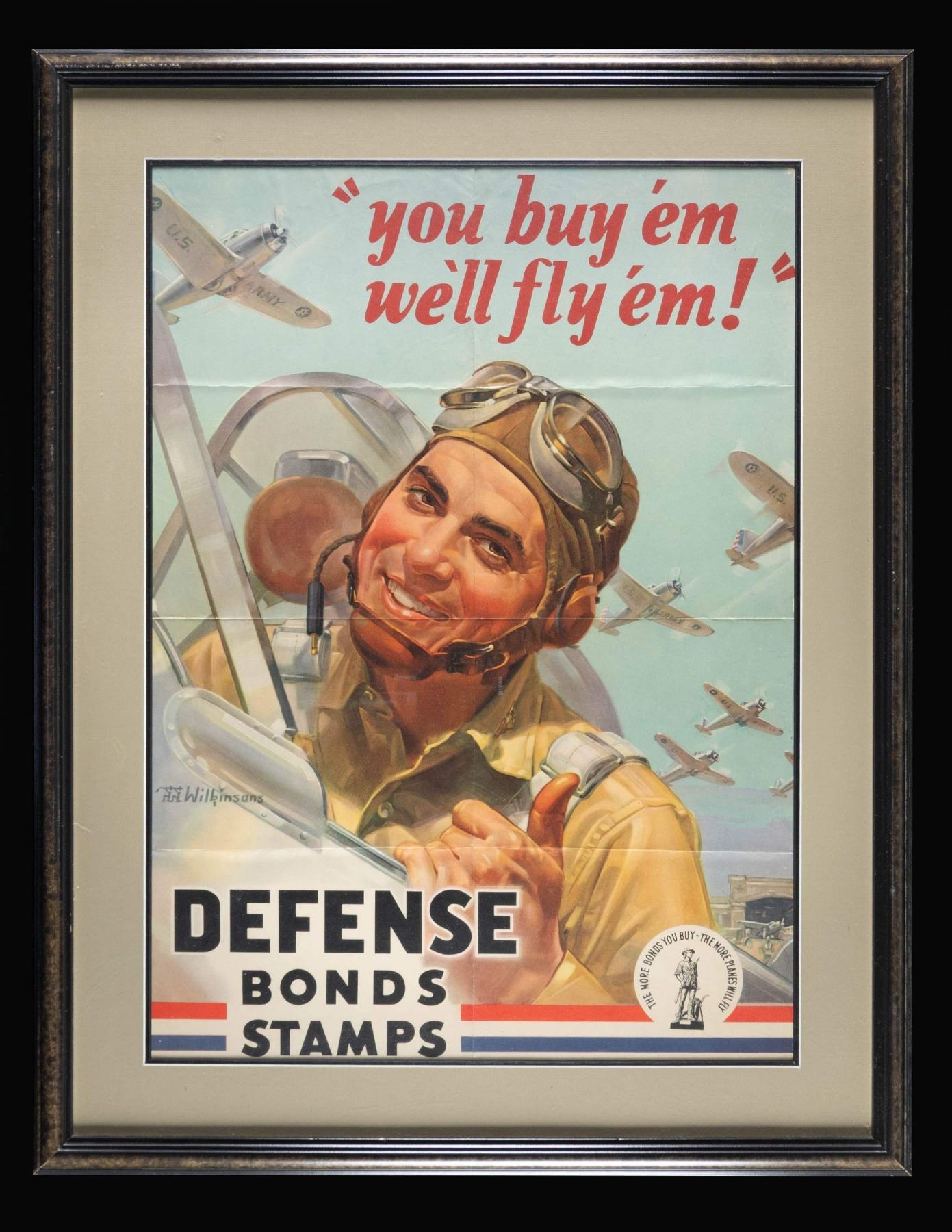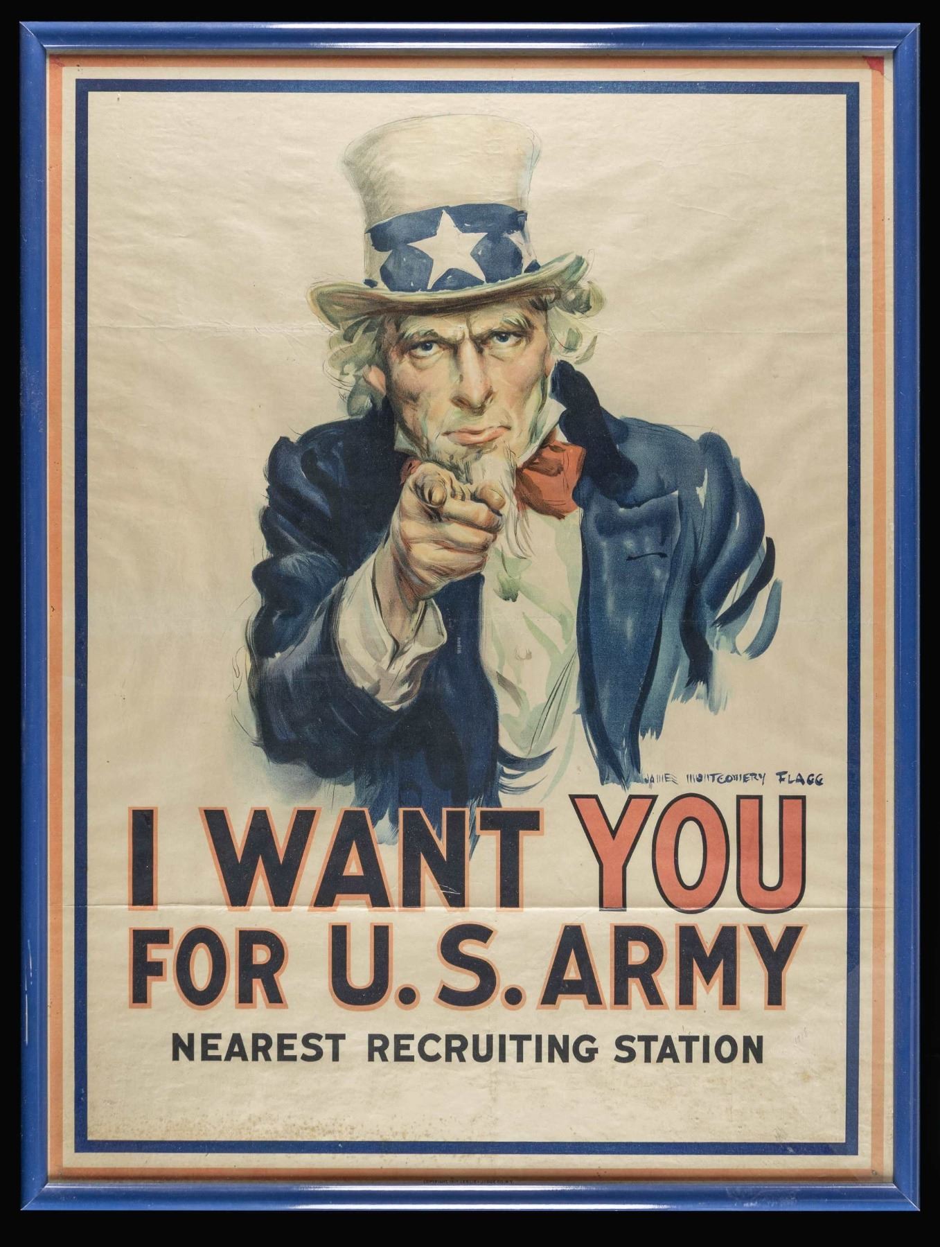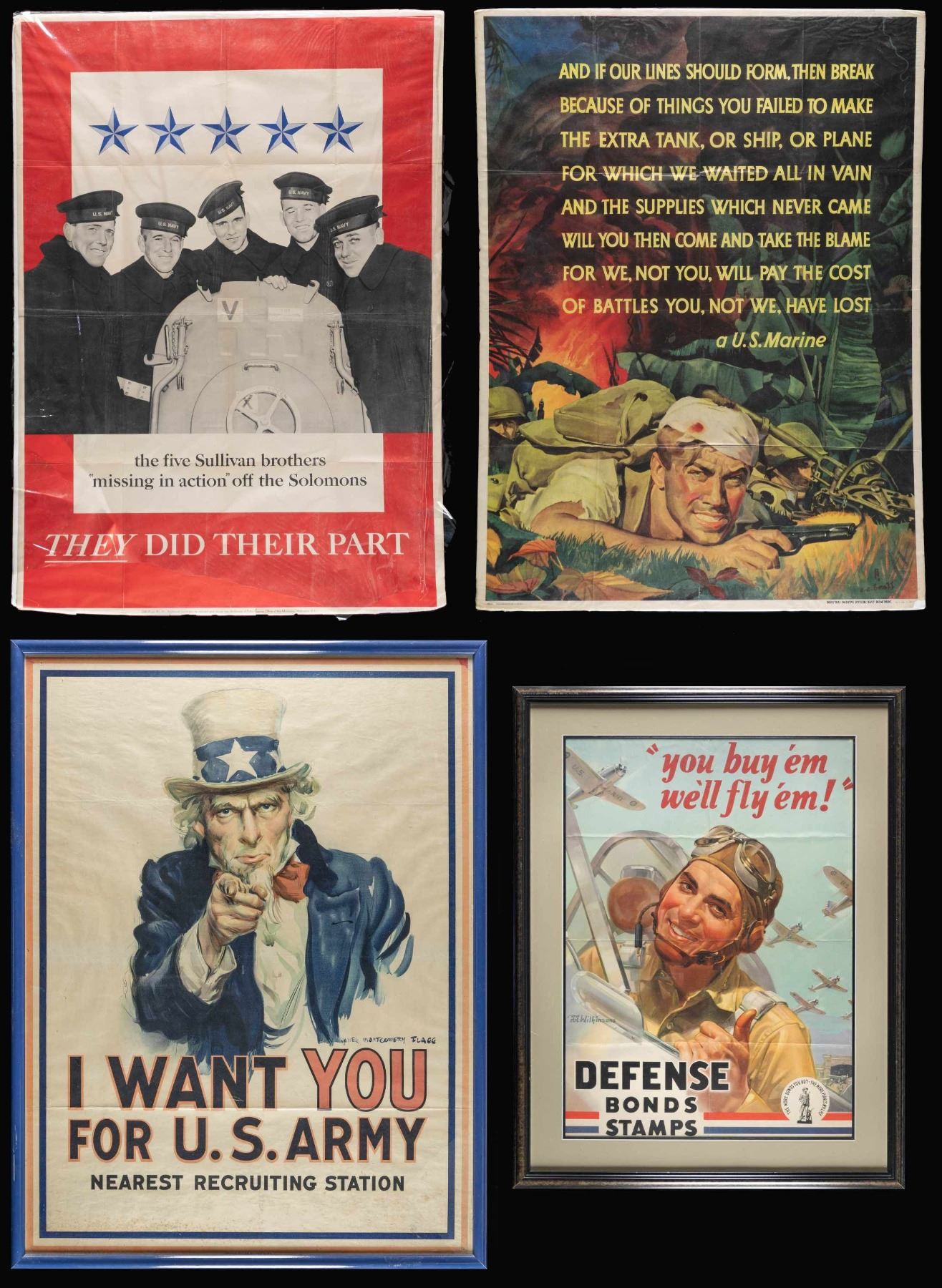 WORLD WAR II POSTERS. 1) 40" x 30", "And If our Line Should Form" US Marine poster designed by CC Beall. Poster wrapped in cellophane & is package on posterboard. CONDITION: Poster in good condition showing creases & sm. piece missing bottom right corner. 2) 40" x 28.5", "They Did Their Part" Sullivan Brother US Navy poster. Poster has posterboard backing & partially covered in cellophane. CONDITION: Poster in good condition with creases & scattered sm. stains. 3) 27" x 19" Poster for Defense Bonds stamped " you buy 'em we'll fly 'em". Poster is contained in 34" x 27" glass front frame. CONDITION: frame appears very good condition. Unable to inspect print underneath glass, but appears good with creases. WORLD WAR I 4) US Army 39.5" x 29.5" poster "I WANT YOU FOR THE U.S. ARMY". Poster in contained in glass front frame measuring 41.5" x 39.5". CONDITION: frame appears very good. Unable to inspect print out of frame, but appears good overall, with small holes in corners from tacks, stains throughout & folding creases. (02-25022/MD). NON-GUN. $400-600.