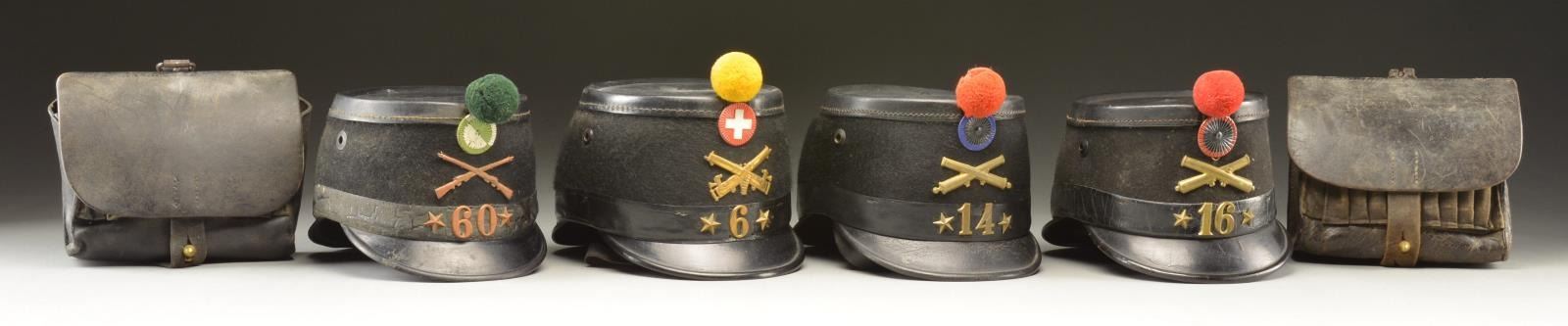 1) 4 SHAKOS. Shakos are of the M1898 style & were worn by Swiss troops during WWI. All 4 have a leather body w/ a black felt central band. The crowns, visors & visor bands are leather. Units include the 60th Infantry, the 16th Artillery, the 14th Artillery & the 6th Machine Gun Infantry. 2 Have 7 tongue leather liners, 1 has an 8 tongue leather liner & 1 has a simple leather sweatband. All have their original unit pompoms & cockades. CONDITION: all shakos show light to moderate wear w/ no notable damage.