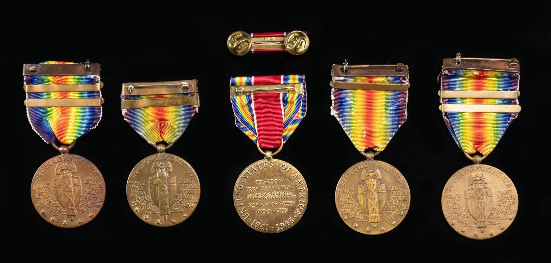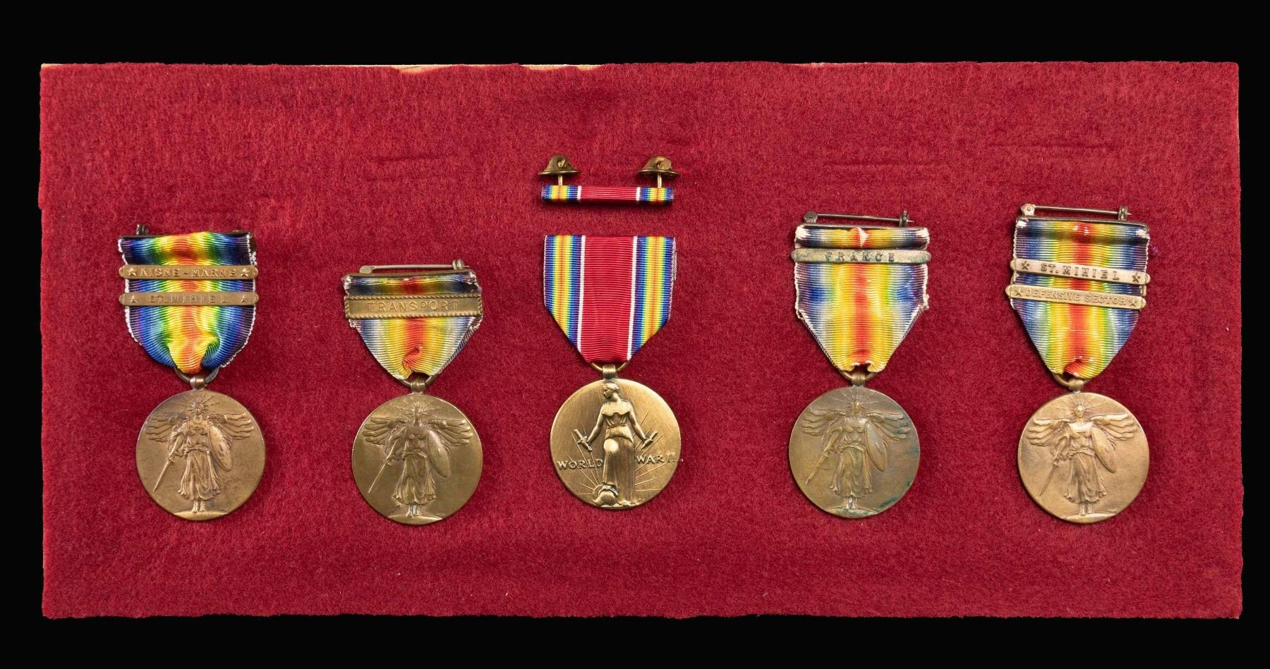 This lot includes 1 WWI medal with "AISNE-MARNE" and "ST. MIHIEL" bars. / 1 WWI medal with a "TRANSPORT" bar. / 1 WWI medal with a "FRANCE" bar. / 1 WWI medal with "ST. MIHIEL" and DEFENSIVE SECTOR" bars. / 1 WWII medal with ribbon bar. CONDITION: WWI examples show light to moderate wear and the WWII example shows no wear, (02-25060/BF). NON-GUN. $200-300.