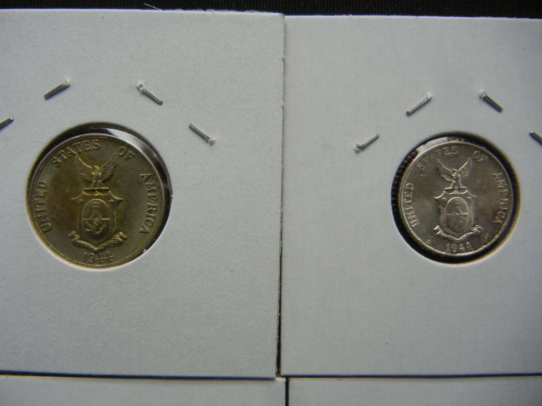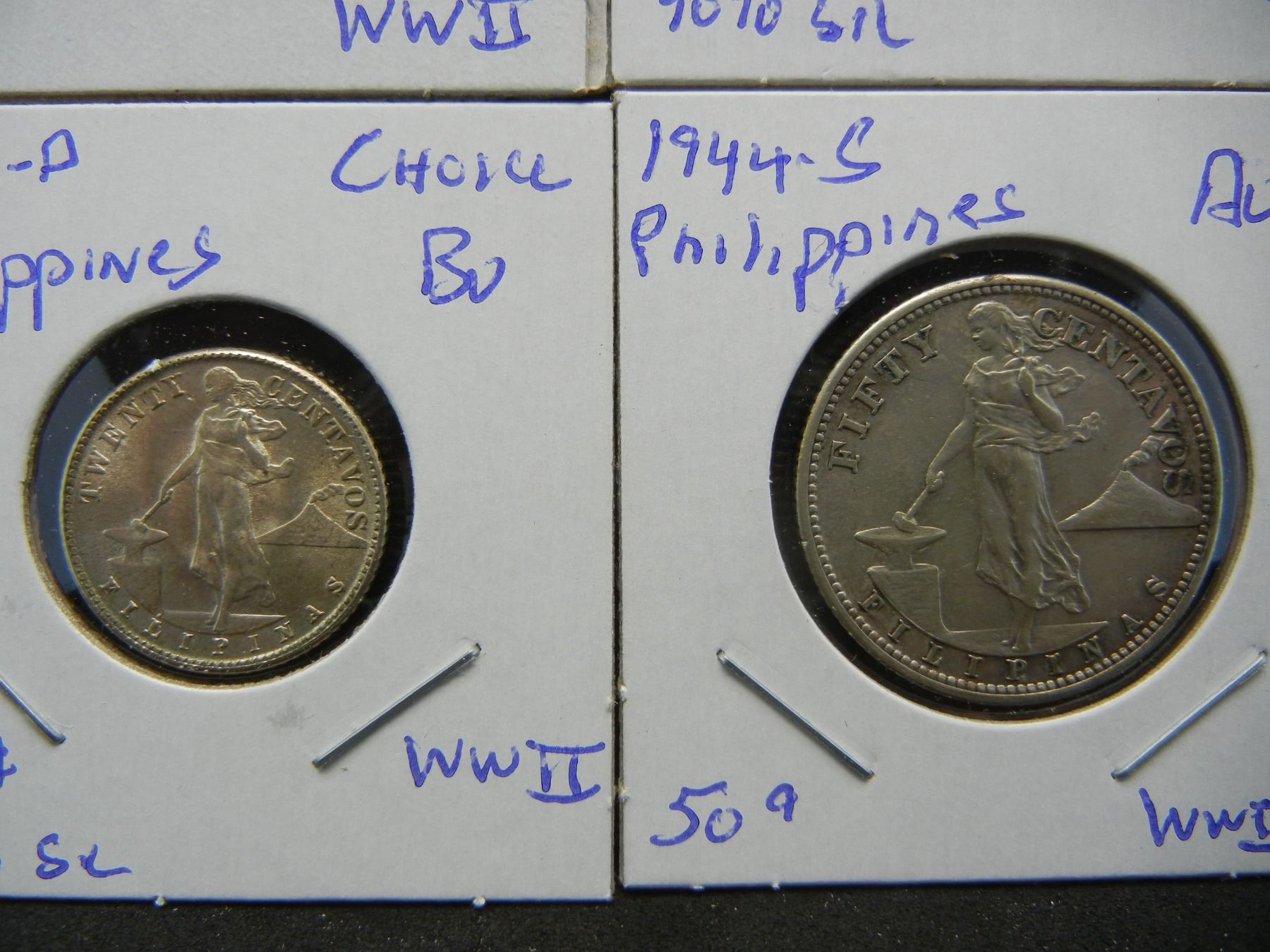 (4) WWII (3 Silver) Philippines coins: 44 Five Cent Choice BU, 44-D 10 Centavo Choice BU, 44-D 20 Centavo Choice BU, and 44-S 50 Centavo AU.