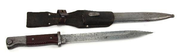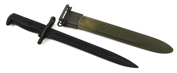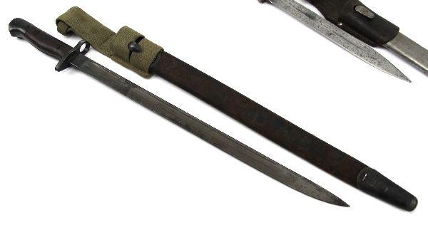 Grouping of four bayonets WWII and earlier. A British Model 1907 bayonet, marked Wilkinson, in very good condition, with scabbard; a WWII German Mauser k98 bayonet, with scabbard and frog, numbers non matching, good condition; a US M-1 bayonet with scabbard, post war production, parkerized blade, very good condition; French Model 1892 Second Pattern Mannlicher-Berthier bayonet, with scabbard, Some rust to scabbard, otherwise very good condition.
