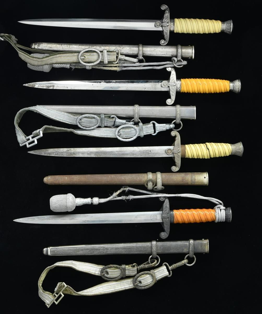 1) Overall length: 15 5/8”. The blade is marked near the hilt “ALCOSO A C (scale) S SOLINGEN”. Eagle crossguard with the party symbol broken off. Oak leaf embellished pommel cap & ferrule. Deep orange composite grip. Hilt has a dagger knot partially correctly tied. Plated scabbard with correct Army dagger hangers. CONDITION: the blade is in the dagger backwards. The crossguard, ferrule, and pommel cap have a dark patina and, as stated, the party symbol & wreath are missing from the crossguard. The grip is undamaged. Knot shows heavy wear. Scabbard is undamaged with dark tarnish. Hanger shows light wear. 2) Overall length: 16”. The blade is marked near the hilt “(knight's head) WKC SOLINGEN”. Eagle crossguard with party symbol in wreath. Oak leaf embellished pommel cap & ferrule. Off-white composite grip. Plated scabbard with correct Army dagger hangers and a knot tied to the top suspension loop. CONDITION: blade shows some factory polish with scabbard wear. Hilt shows light overall wear. Scabbard has a few shallow dents. One of the spring clips on the hanger is missing the front bar. Knot shows heavy wear. 3) Overall length: 16”. The blade is marked near the hilt “(logo) C.D. SCHAAFF SOLINGEN”. Eagle crossguard with party symbol in wreath. Oak leaf embellished pommel cap & ferrule. Light orange composite grip. Plated scabbard with correct high-grade Army dagger hangers. CONDITION: blade shows some original factory polish but also has scattered staining throughout. Hilt shows light wear overall. Scabbard & hangers show light overall wear. 4) Overall length: 15 5/8”. The blade is unmarked. Plated gray metal eagle crossguard with party symbol in wreath. Oak leaf embellished pommel cap of similar metal, and an iron ferrule. Off-white composite grip. Plated scabbard. CONDITION: blade has staining throughout but no pitting. Mounts have a gray, oxidized patina, and the grip is cracked in half. Scabbard has an oxidized finish, and the top suspension band is loose. (02-20896/BF). $1,200-1,500.