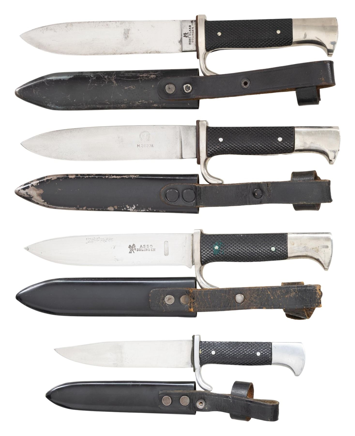 1) A fine HJ knife measuring10" overall with a 5 1/2" blade that is engraved " Blut und Ehre ". The reverse of the blade marked " RZM M7/67 38 ". 2-piece black composite grip with enameled HJ diamond on the front. Black enameled scabbard with integral belt loop. 2) A fine HJ knife measuring10" overall with a 5 1/2" blade that is engraved " Blut und Ehre ". The ricasso is marked " RZM M7/37 1936 " and " (logo) ROBT KLASS SOLINGEN ". 2-piece black composite grip with enameled HJ diamond on the front. Black enameled scabbard with integral belt loop. 3) A fine HJ knife measuring10" overall with a 5 1/2" blade. The reverse of the blade is marked " (logo) ASSO SOLINGEN " & " GES GESCHUTZT ". 2-piece black composite grip with enameld HJ diamond on the front. Black enameled scabbard with integral belt loop. 4) A scarce small child size HJ knife measuring 8 1/4" overall with a 4 1/2" blade that is unmarked. 2-piece black composite grip. Black enameled scabbard with integral belt loop and an enameled HJ diamond on the front. CONDITION: all knives show light wear remain in fine condition overall. (02-24930/BF). NON-GUN. $1,000-1,500.