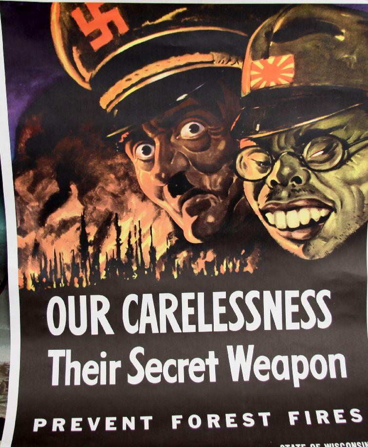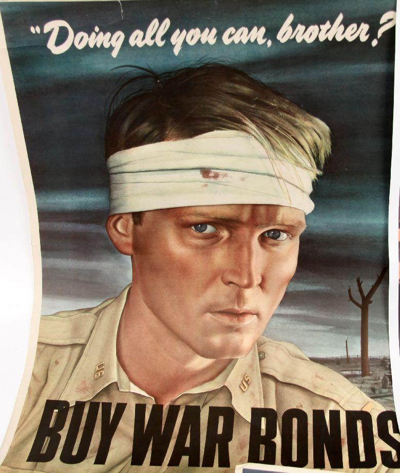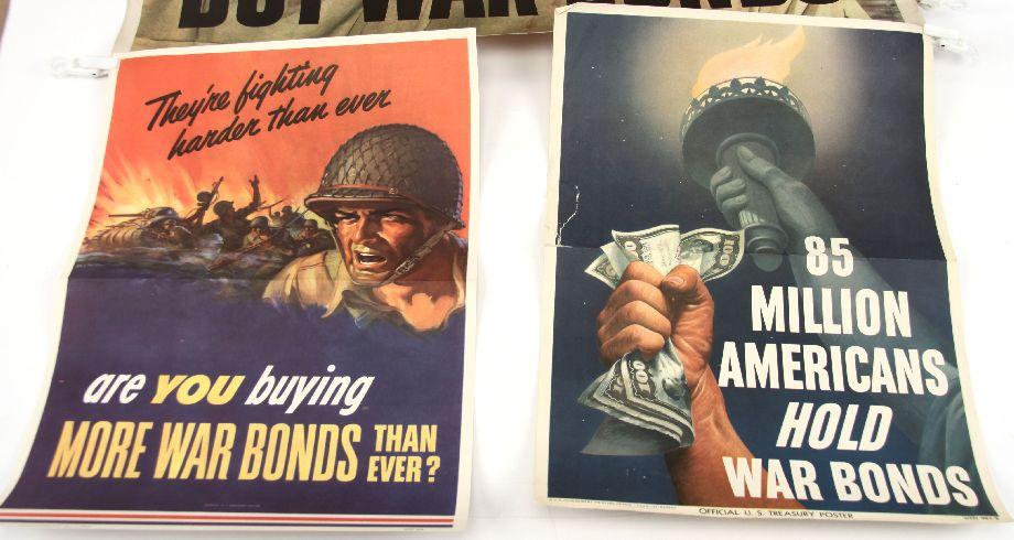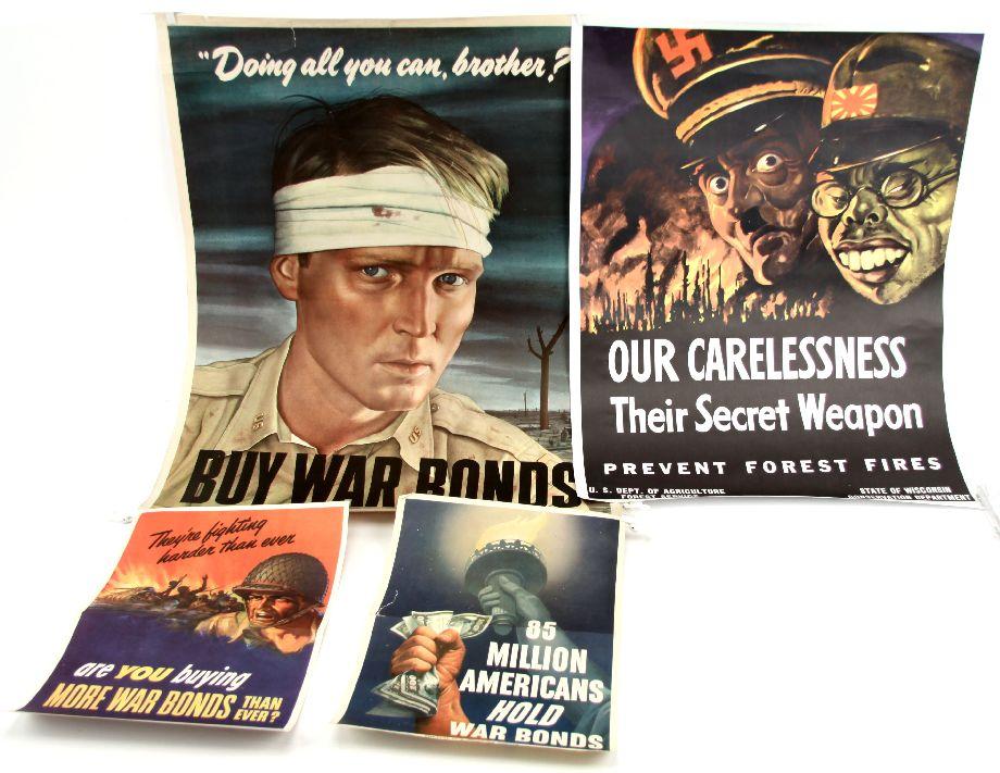 Lot of WWII Official US Treasury War Bond Propaganda posters to include: 14 x 10 inch 1943 "They're fighting harder than ever, are you buying more war bonds than ever? (crease line in middle); 14 x 10 inch 1945 "85 million Americans hold war bonds" (2 inch tear on left margin, crease line in middle); 1943 Robert Sloan 28 x 22 inch "Doing all you can, brother? Buy War Bonds" (tears to the upper right margin, and small 1/2 inch tears to the corners/outside margins). Also included in this lot is a reprint of an US Department of Agriculture Forest Fire 26 x 20 inch "Our carelessness is their secret weapon" poster. All posters are in good-very good condition.